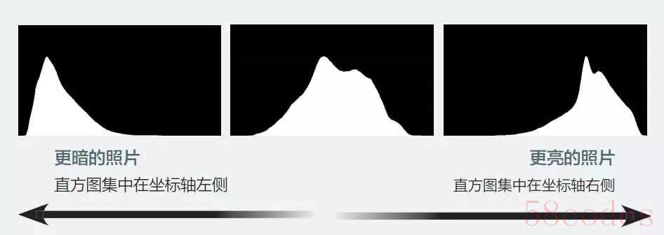 在这张例图 中,直方图的波峰主要集中在坐标轴中间及左侧阴影部分,右侧高光部分信息不足。想要改善这种情况,用户可以增加曝光补偿、增大光圈、降低快门速度、提升ISO值(对页有更多详细内容)等。