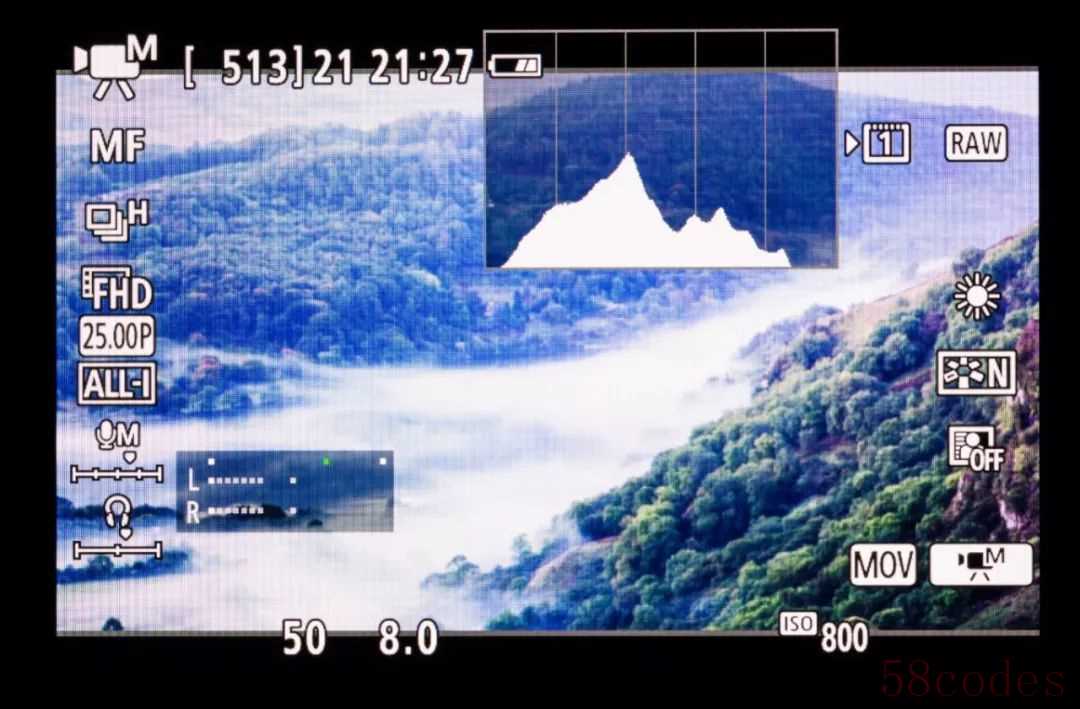 在使用机背屏幕或者电子取景器取景时,可通过直方图来确认当前画面的曝光参数是否合适,无论拍摄照片还是视频时都可显示。