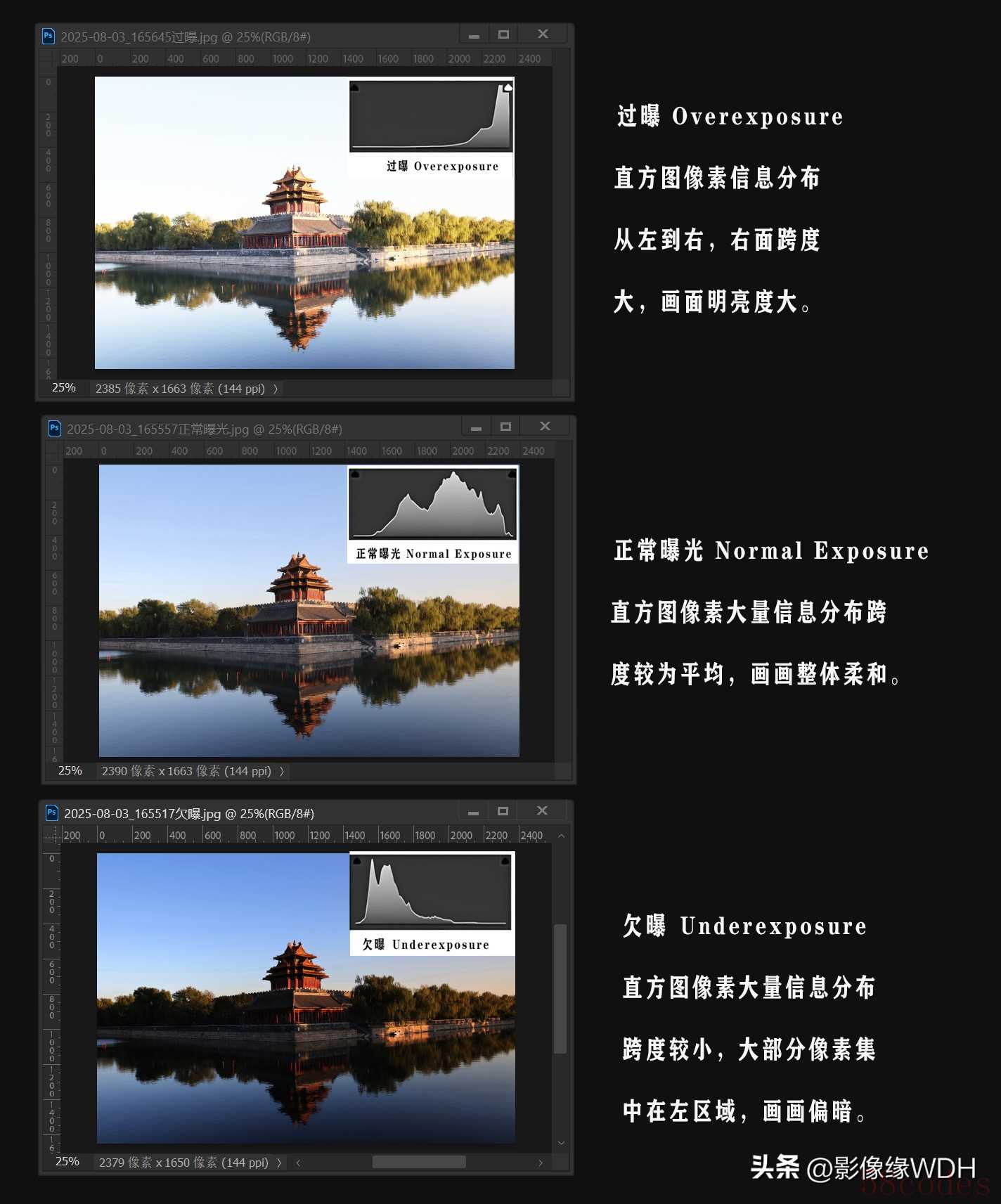 本次实验基于同一场景拍摄的过曝、正常曝光与欠曝三组图像,通过直方图工具量化分析不同曝光状态下像素亮度的分布规律,系统比较其动态范围与细节保留能力的差异。(如下图所示)