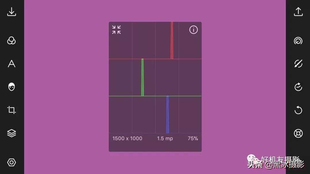 首先观察一下通道直方图左端的情况,可以发现在最左端红色通道直方图和蓝色通道直方图都有凸起,而绿色通道直方图最左端没有凸起,而直方图从左到右对应的是画面中从暗到亮的区域,所以画面的阴影部分应该呈现出红色和蓝色的混合色也就是紫色。