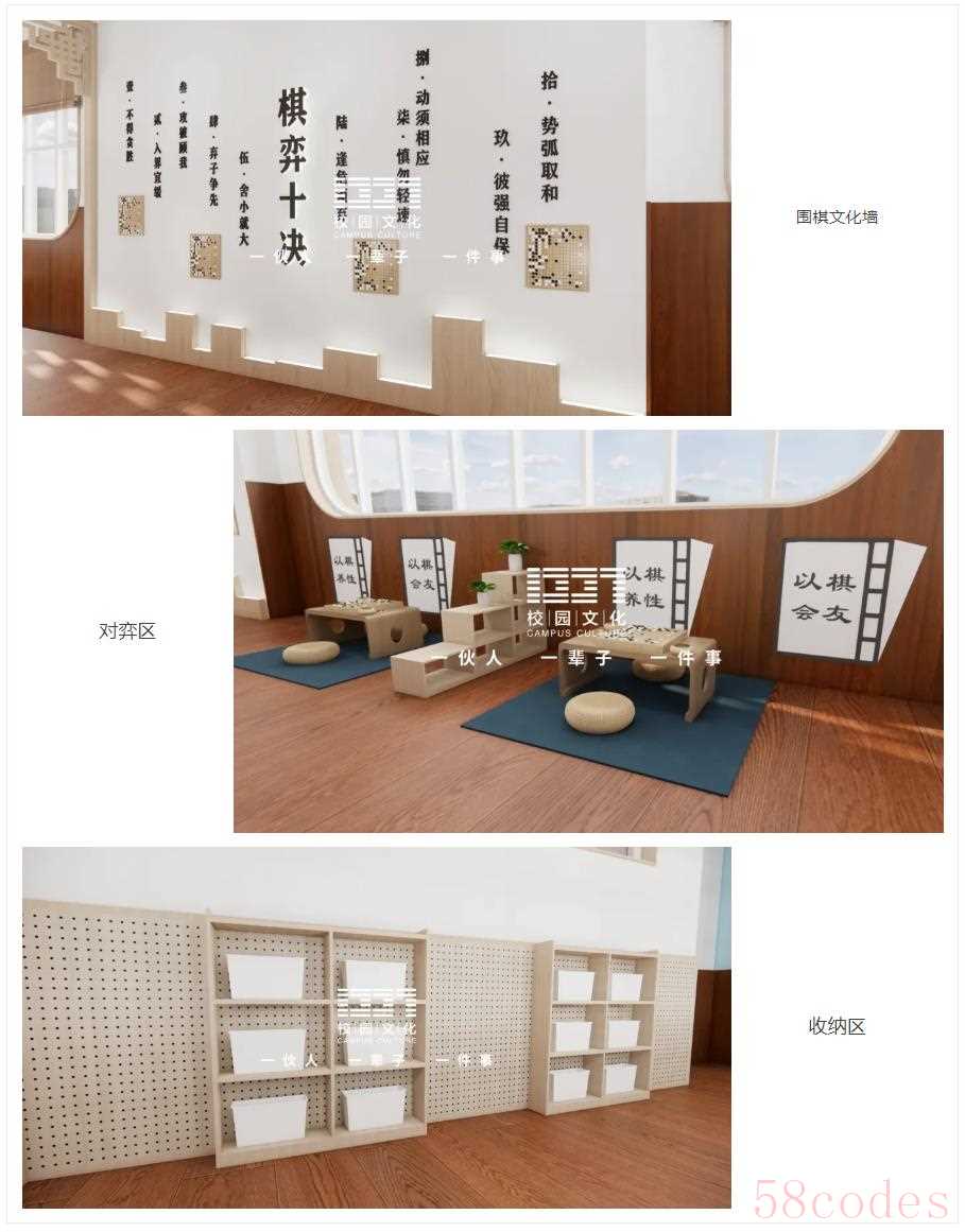廊道墙面上以围棋文化为核心,对围棋的规则进行了介绍。我们充分利用有限空间,在廊道一侧摆放围棋桌椅,为孩子们提供一个既能学习又能休憩娱乐的区域。同时我们还设置了收纳空间,让孩子们从小养成整理收拾的好习惯。
