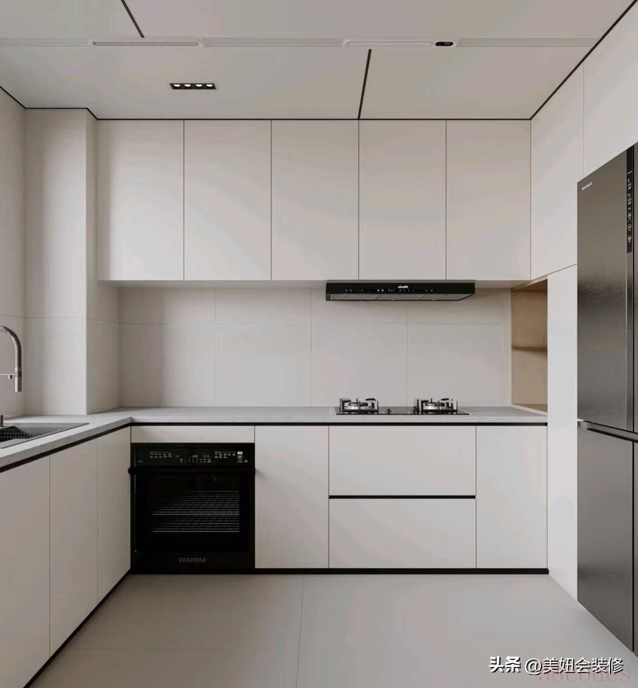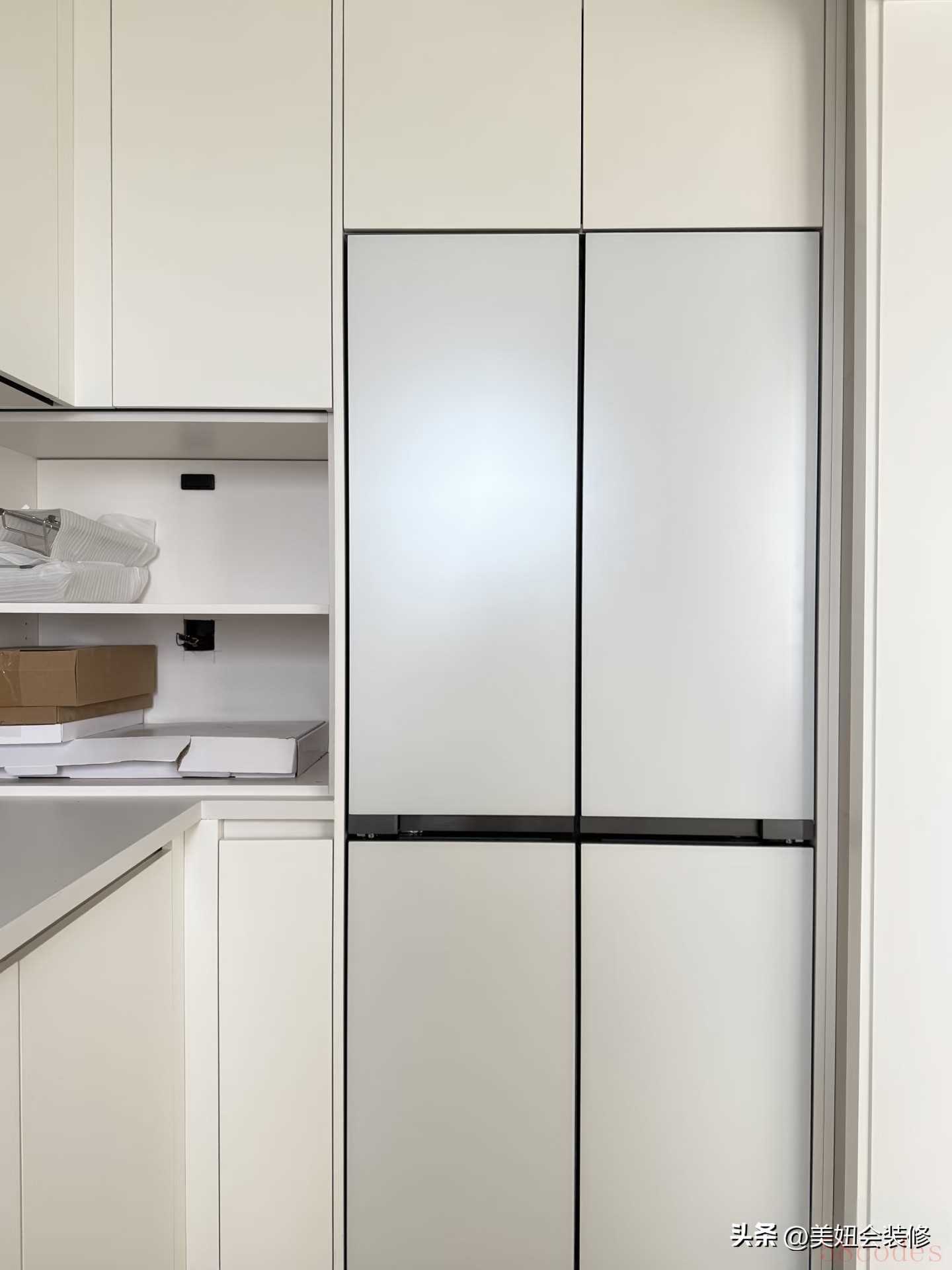 4. 嵌入式冰箱:与橱柜平齐,视觉上更统一,还能利用冰箱侧面空间做薄柜放零食。