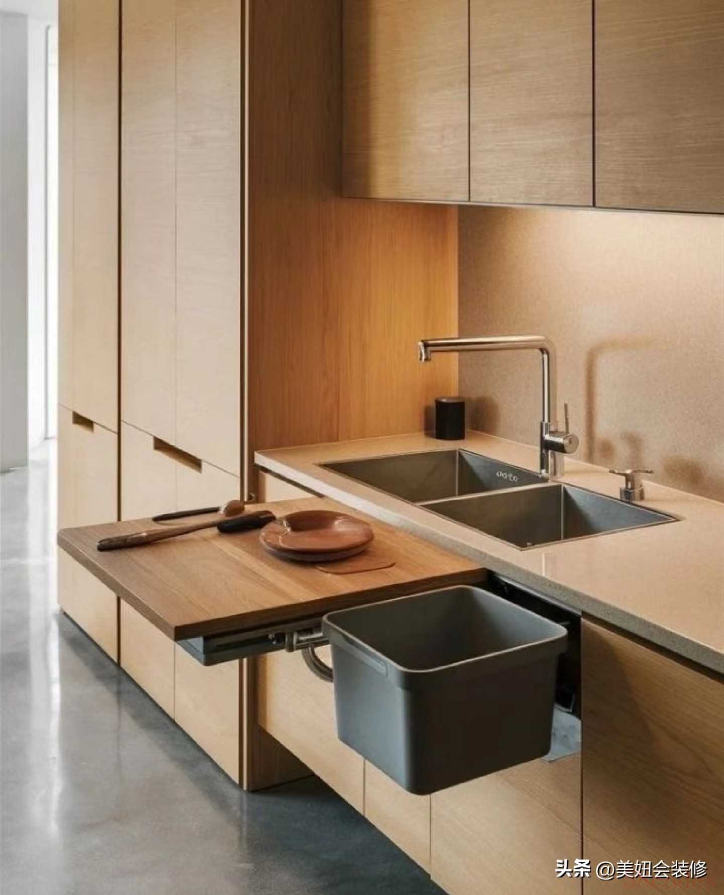 大部分厨房的矛盾的是“做饭时台面不够用,平时又嫌占地方”,解决办法就是让台面“灵活起来”。1.可抽拉式操作台是小户型福音:平时收在橱柜里,备菜时拉出来长度可延伸至80-100公分,切菜、摆盘都够用;用完一推,厨房立刻回归清爽。
