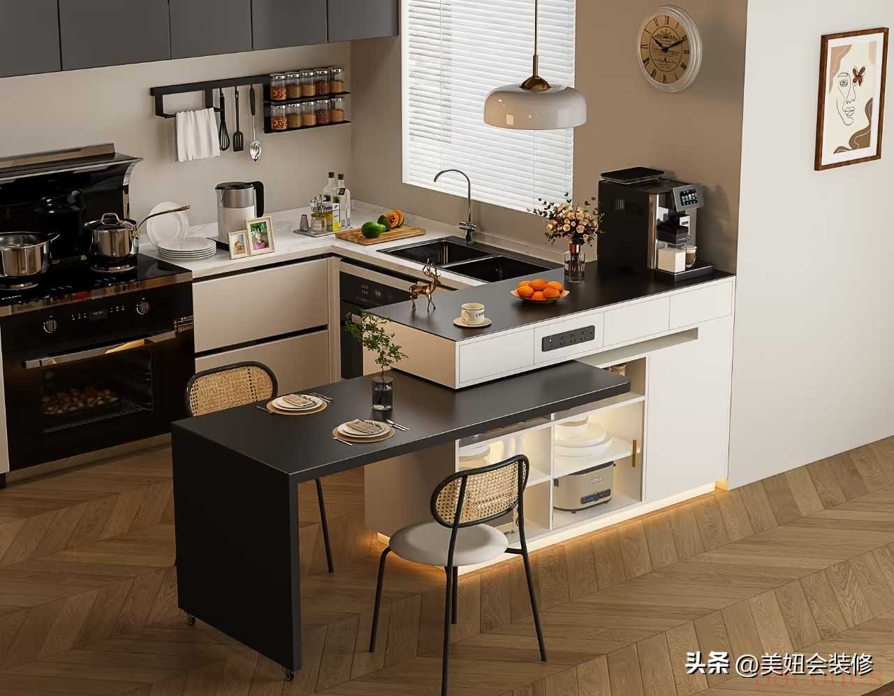 这些嵌入式电器功能整合后,厨房台面被“释放”,操作动线更顺畅。三、灵活台面:可抽拉可折叠,按需变身不占地