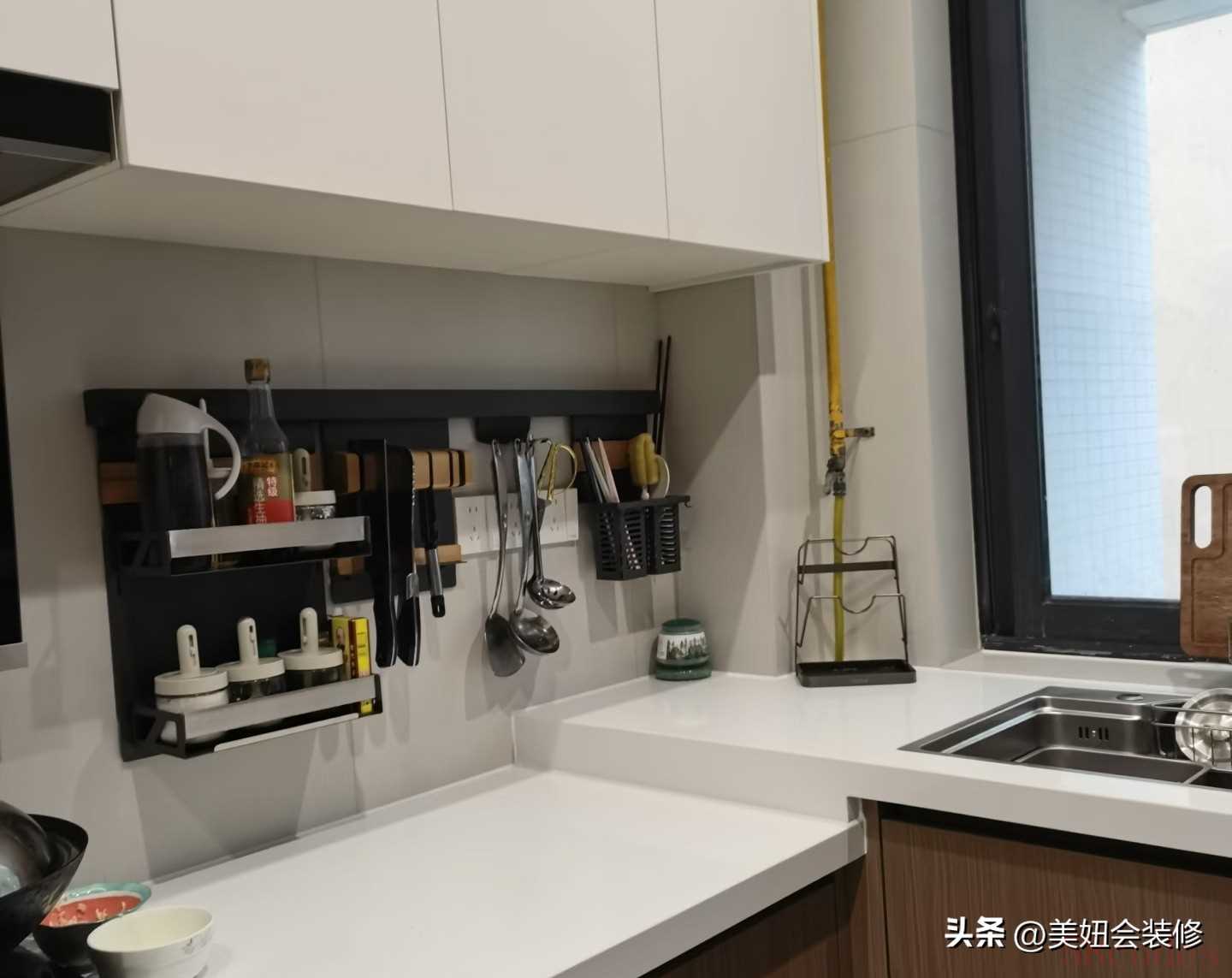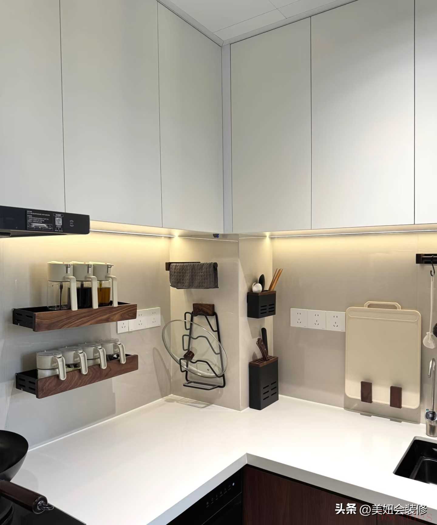 2. 做墙面“隐形收纳区”:灶台两侧设置挂件系统,把锅铲、汤勺、漏勺等常用工具全部上墙;