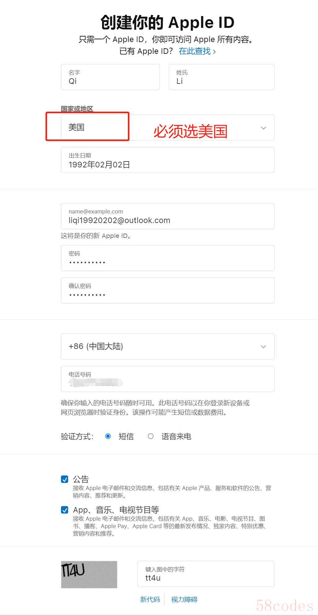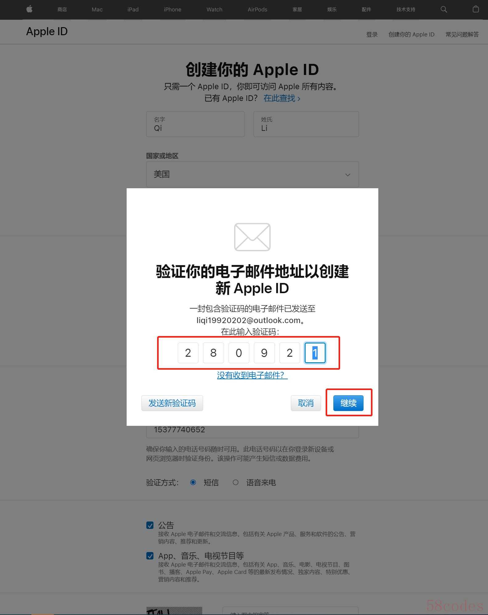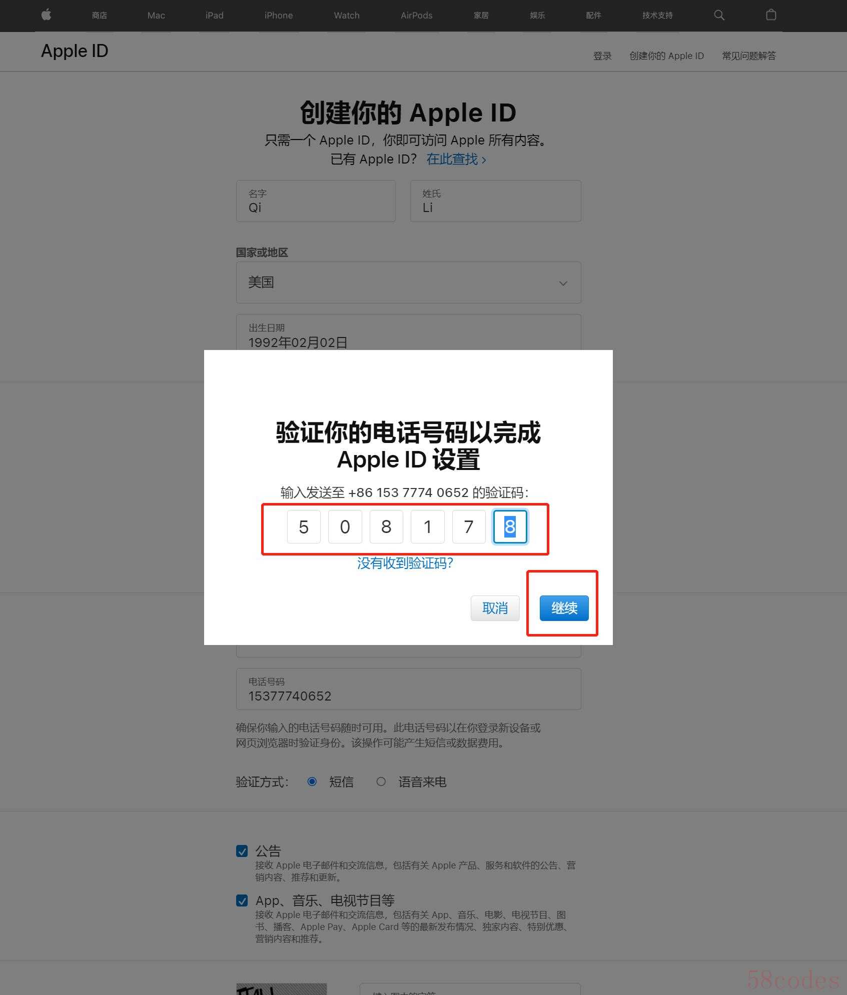 第二步:填写信息,国家必须选“美国”,出生日期必须选一个大于18周岁的日期,号码用国内的就行,输入验证码,点击“继续”