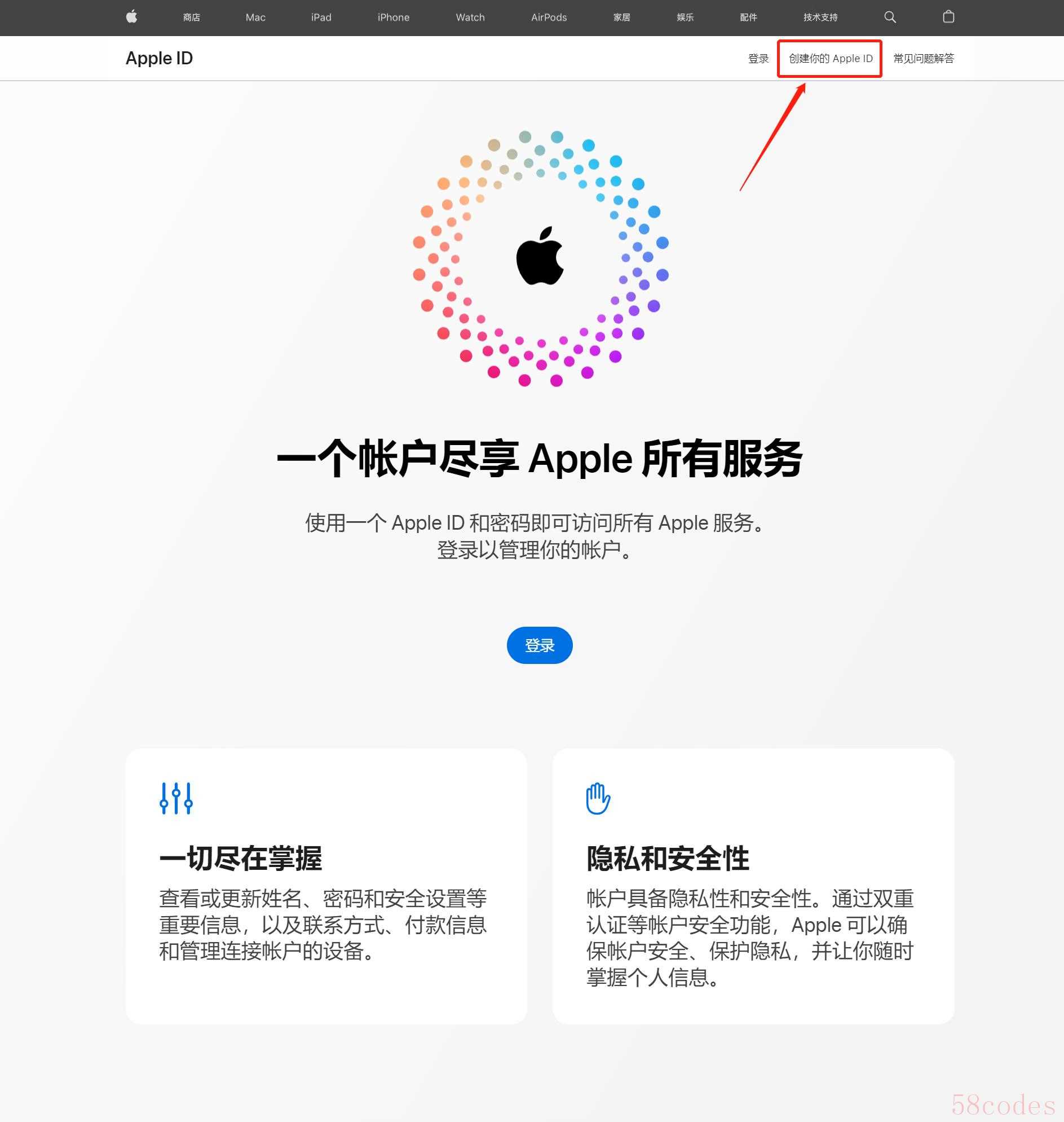 第一步:登录Apple ID官网,右上角“创建你的Apple ID”