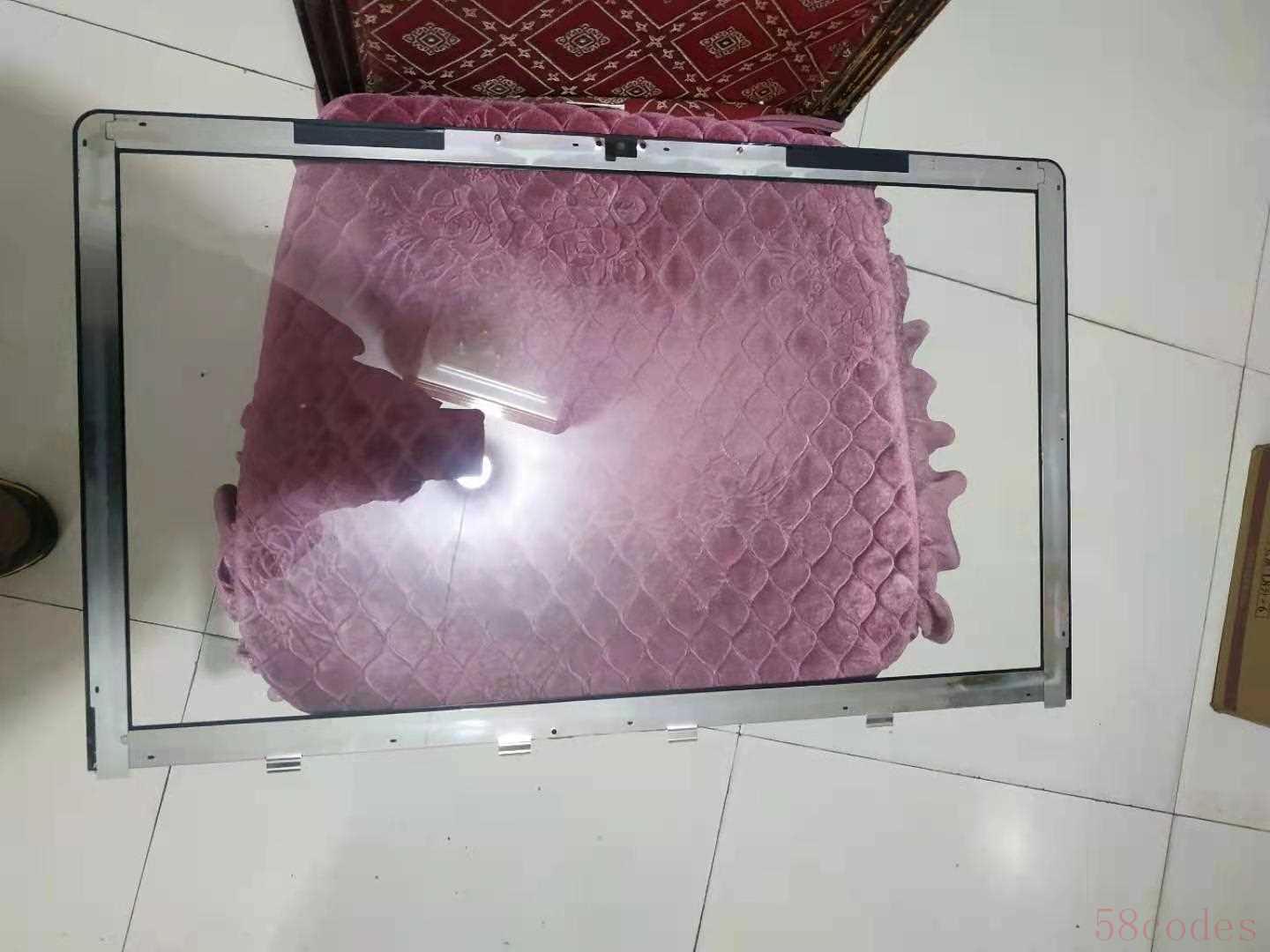 4.把一体机平躺台桌子上,用六角螺丝刀把左上右三边的螺丝拆下,就可以把屏从背壳中扣出来,注意不要把背光线,屏线和其它线扯断。