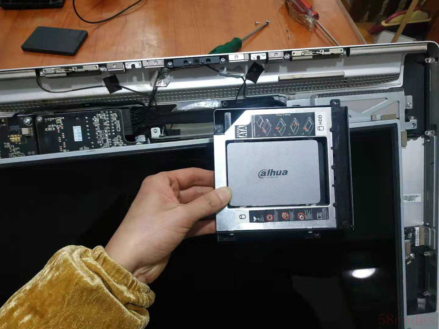 5.到这步我偷了一个懒,没有完全把屏拆下来(屏线连着主板),而是把一体机底座夹在自己大腿中间,让屏幕成45度角靠在自己胸前,并且让一体机背面顶住桌子,这样我的双手可以空出来直接拆出坏硬盘。