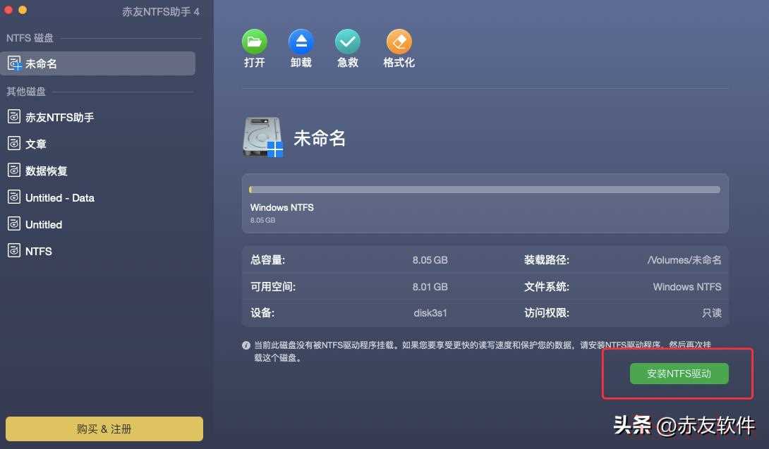- 第一步:将NTFS for Mac工具(赤友NTFS助手)安装在您的Mac上;