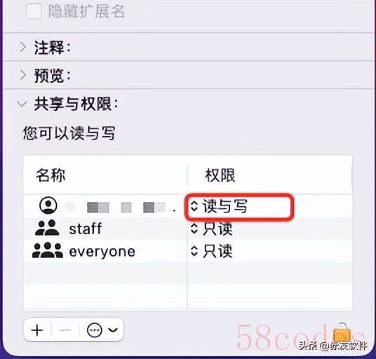 (2)在页面下方的“共享与权限”中点击用户的权限,选择读与写。