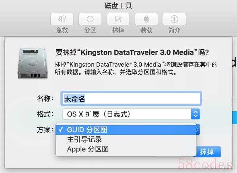 在Mac系统中抹掉(格式化)磁盘的时候,要求选择分区方案,包括GUID分区图、主引导记录、Apple分区图3个选项。