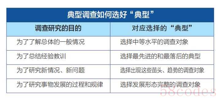 做好典型调查的关键在于选择好“典型”。如果调查目的是为了了解总体的一般情况,可选择中等水平的调查对象;如果调查目的是为了总结经验教训,可以选最先进的和最落后的典型;如果调查目的是为了研究新情况、新问题,可以选择出现这些苗头、趋势的调查对象;如果调查目的是为了研究事物发展的过程和规律,就要选择发展形态完整的调查对象。