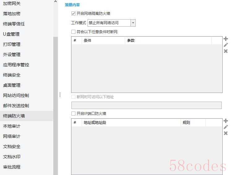 (2)网络隔离防火墙:构建纯内网环境在策略模板中选择“终端防火墙”,勾选“开启网络隔离防火墙”,设置工作模式有“仅允许内网访问”、“仅允许访问内部互联区”、“禁止所有网络访问”。实时告警与阻断:当员工尝试连接外网时,系统立即触发弹窗告警,并自动阻断连接请求。