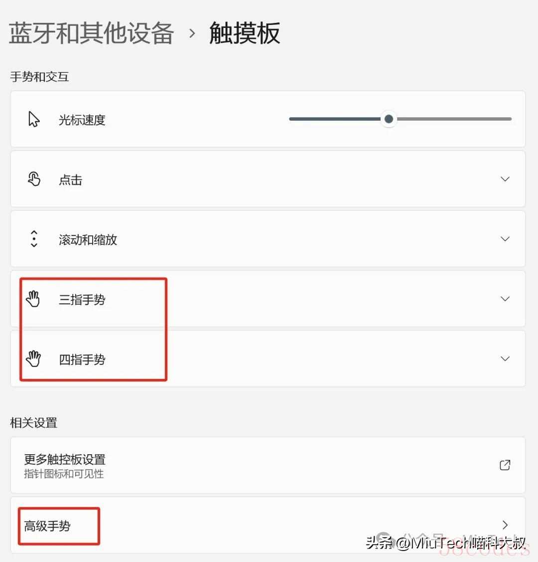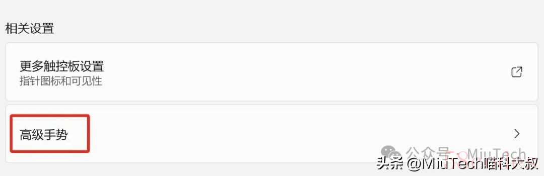 在触摸板界面,如果看到有许多和【手势与交互】相关的选项,另外还有【高级手势】选项……