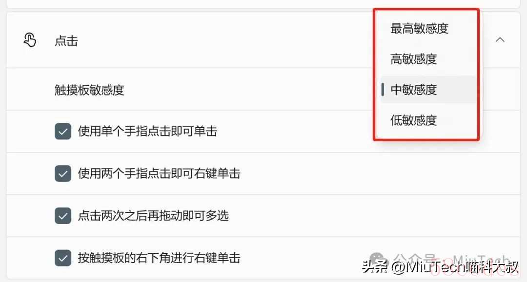 触摸板灵敏度有4个选项可选,主要跟“触控是否稳定”有关,过于灵敏容易误触造成误操作;不够灵敏则指针可能会漂移不定。