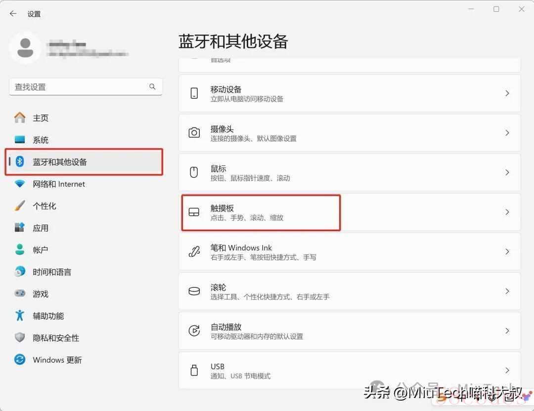 首要条件是笔记本须支持 Windows Precision 触控板,当前市面上多数主流笔记本电脑都支持,十年前的旧电脑则不好说。Windows Precision 触控板(简称 PTP)是微软为提升笔记本电脑触控板体验而制定的硬件标准,要求厂商遵循统一的驱动协议和交互规范。无需安装第三方驱动,直接由 Windows 系统管理。此外,电脑操作系统最好升级到Win10、Win11。怎么确定自己的电脑支不支持自定义触摸板?按下Win + I 打开设置,选择【蓝牙和其他设备】,选择【触摸板】: