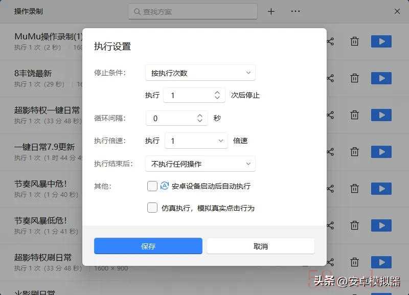 要后台挂机玩游戏,可以使用MuMu模拟器的操作录制功能。操作录制实现自动化点击执行操作,还可以自行设置停止条件和执行间隔,解放双手,大幅度提升挂机效率和稳定性!要使用MuMu模拟器操作录制,可前往MuMu模拟器官网首页顶部 “帮助” 搜索 “操作录制” 等相关问题。