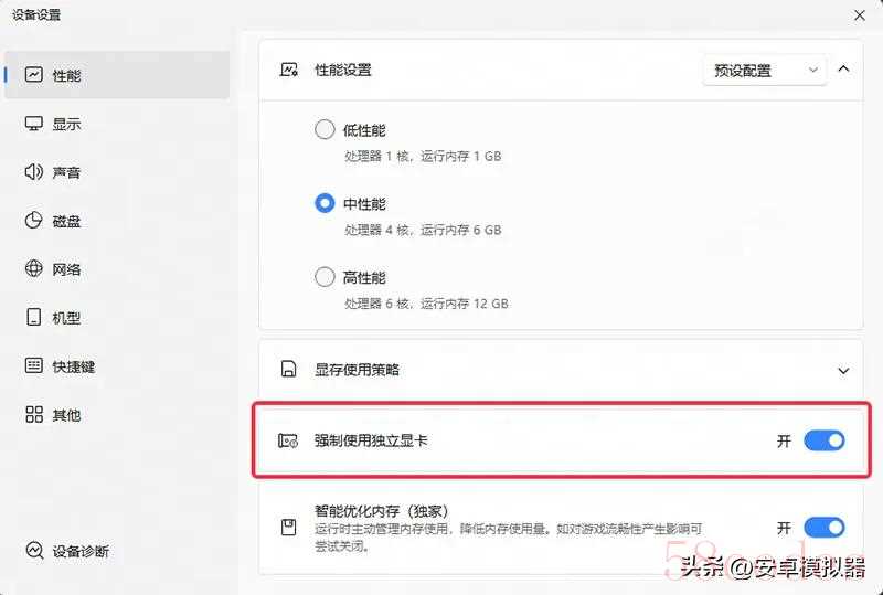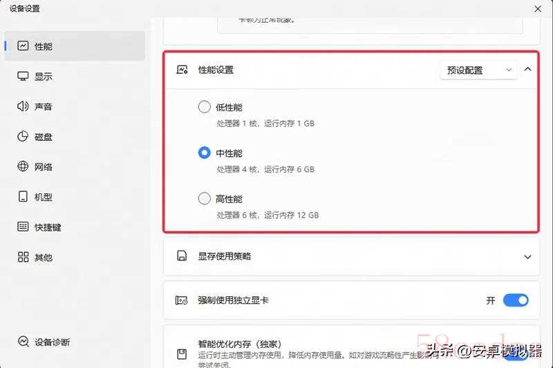 大部分用户将性能设置为“中”即为合适配置,可流畅运行绝大部分游戏,配置较差的玩家,自定义不低于“2核/2G”,如果游戏包过大或者游戏画质要求高,则不低于“4核/3G”。