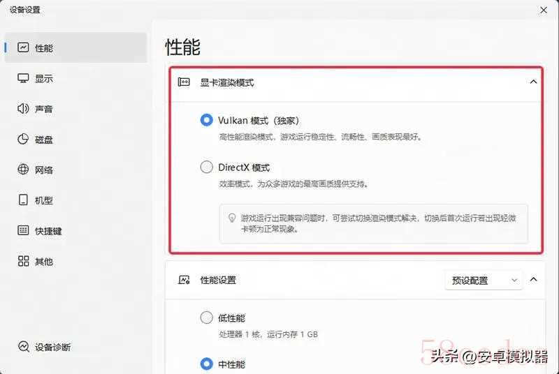 点击模拟器右上角-设置中心-性能,将性能设置调至合适状态;