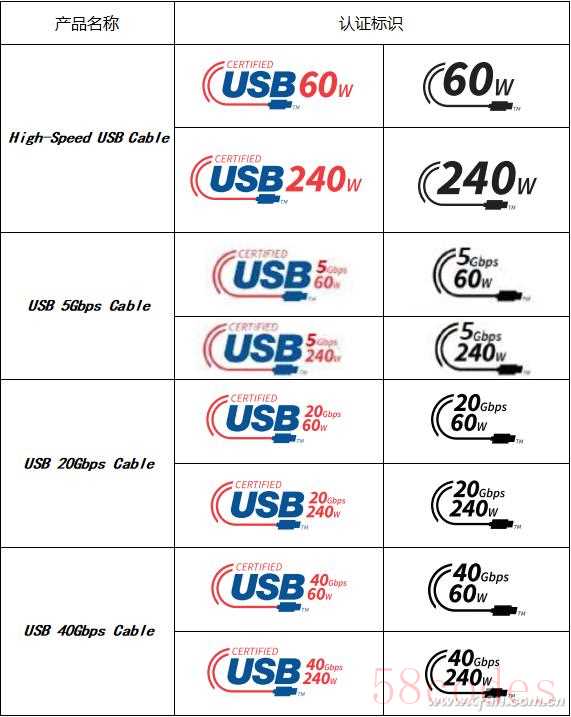 所以,最终Type-C连线就变成了下面这些档次,Logo也已经确定。其中480Mbps作为基础,不做特殊标识,其他的速度都与功耗组成很明确的Logo,可能会印刷或者刻印在线缆、接头上,也可能以标签方式附加在线缆上。以后大家购买新线缆,或者整理、使用不同设备的线缆时,终于有了醒目又的依据。