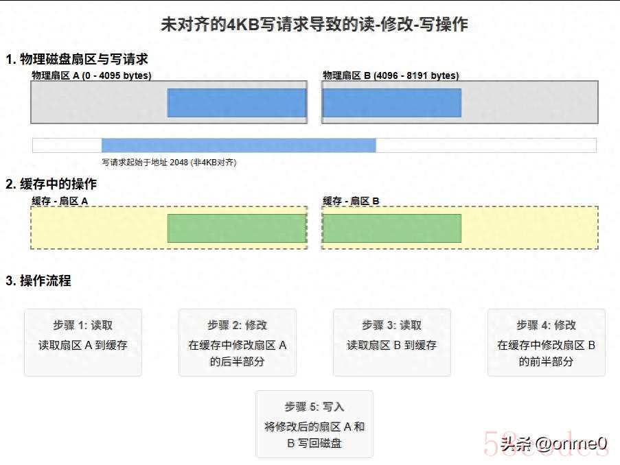 如下图所示,如果一个未对齐的4KB写请求(蓝色)跨越了两个物理扇区(灰色),硬盘必须执行以下操作: