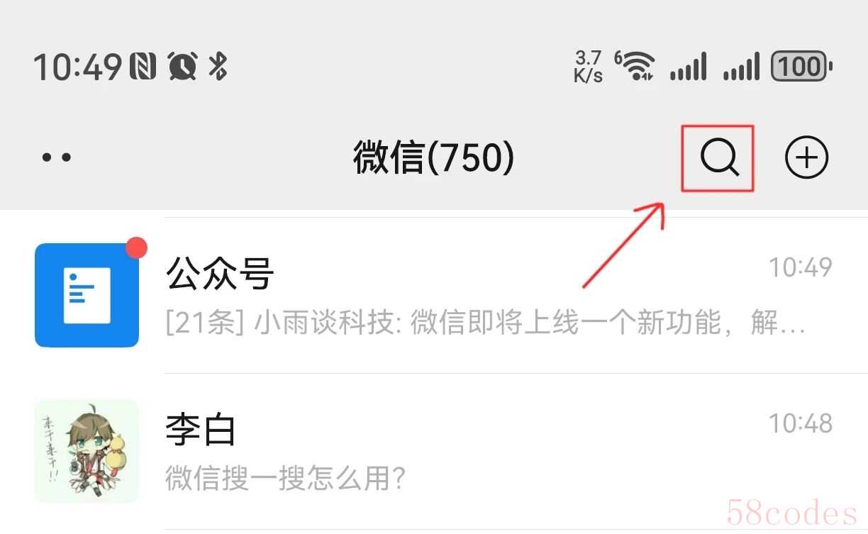 进入微信的主界面,点击右上角的放大镜图标,就会出现一个搜索框。
