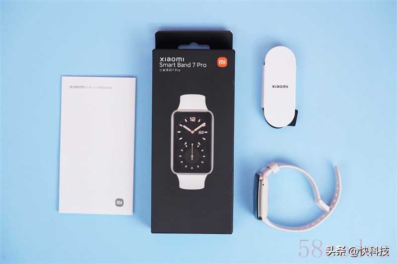 包装内附带的小米手环7本体和附带的磁吸式充电器、说明书。