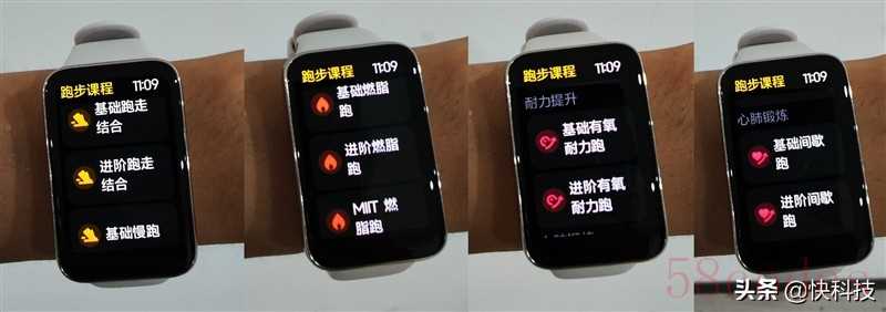 从菜单有独立的腕上跑步课程入口,可以细分为四大类:基础训练有基础跑走结合、进阶跑走结合、基础慢跑。