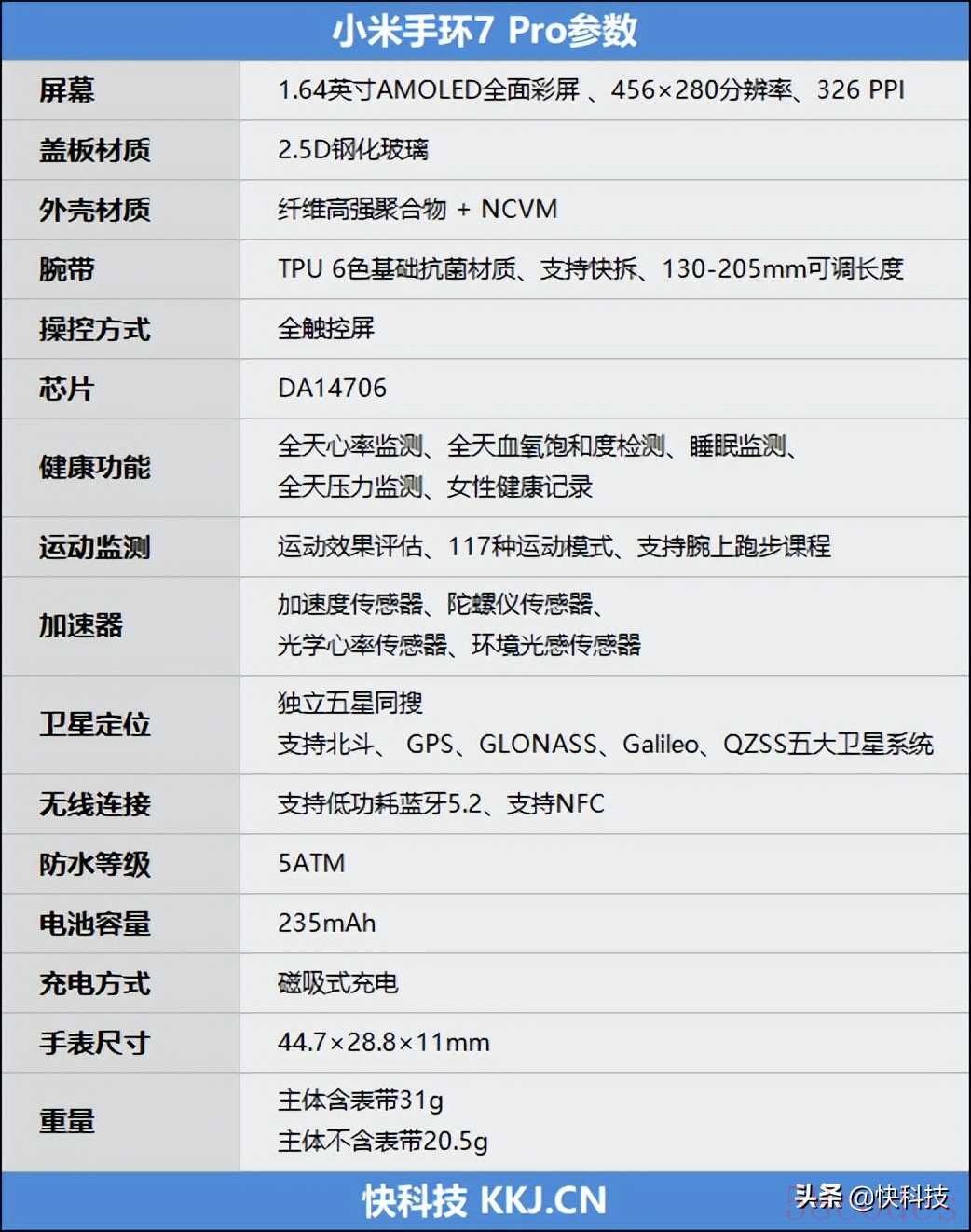 接下来我们来看看小米手环7 Pro的表现,下图为具体参数信息: