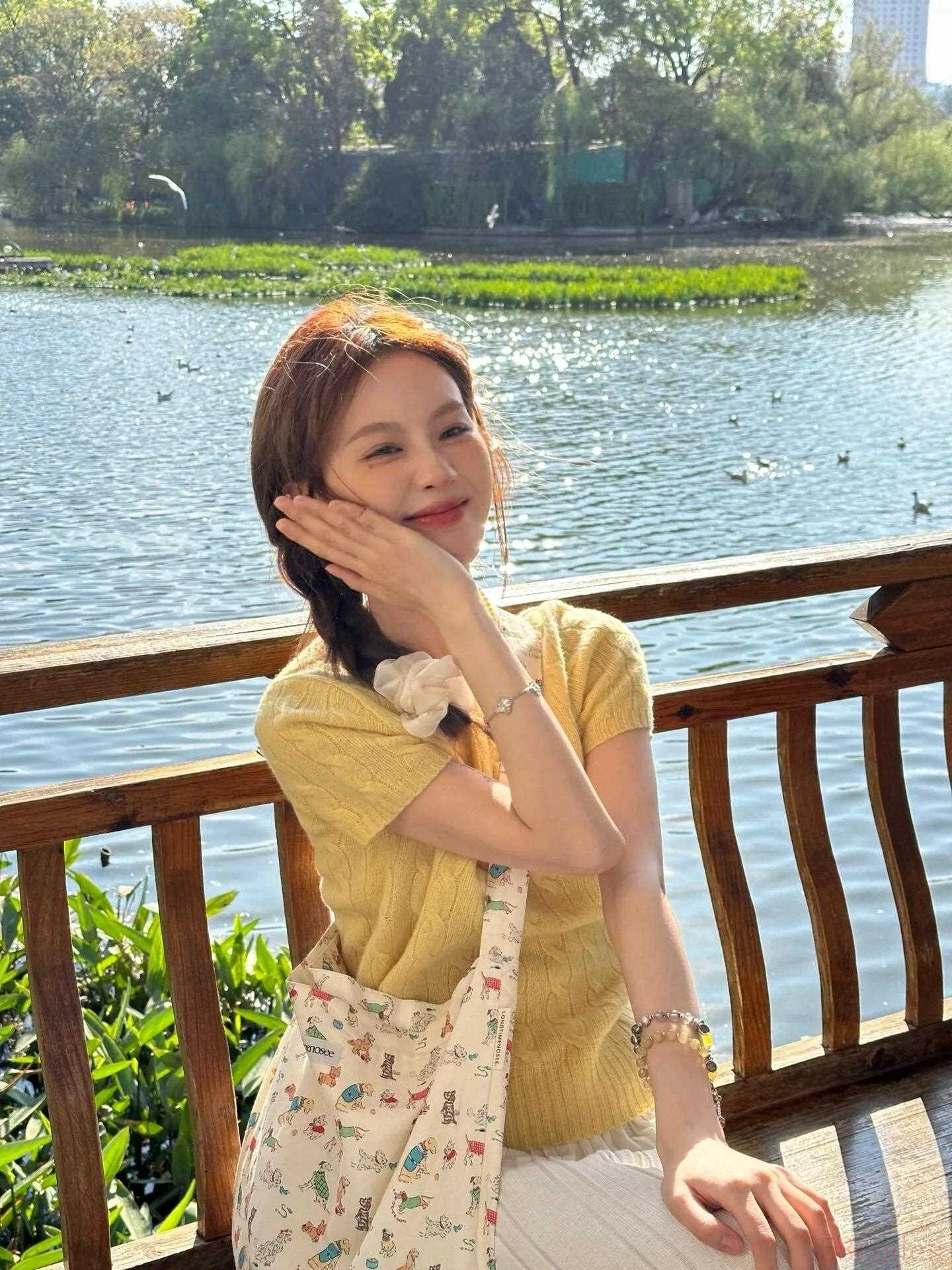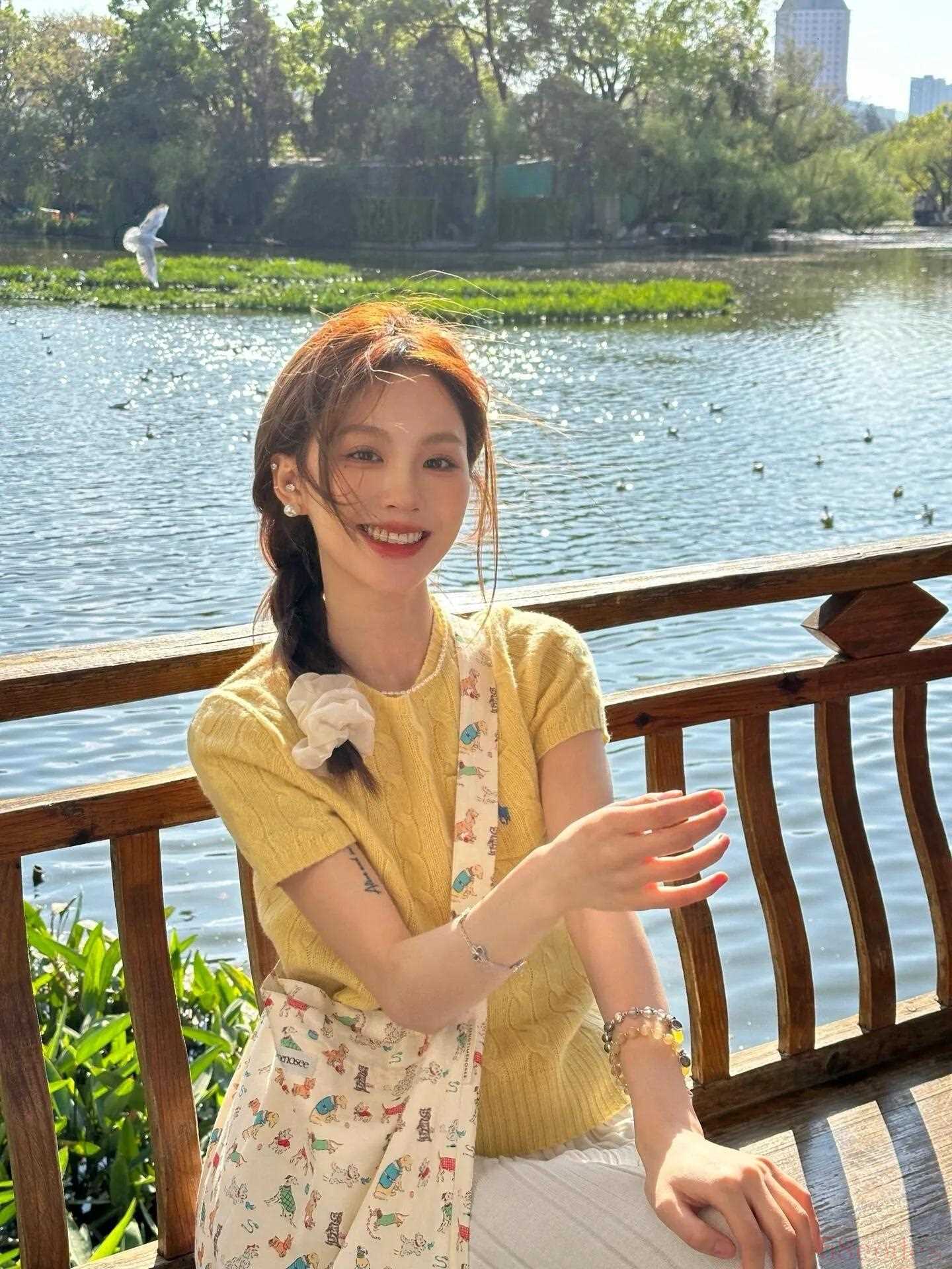 最好能用整片的湖面做背景,没有办法的话,至少要确保水平线别切头。我们变换个动作,贴脸笑着来一张,特别甜美治愈,跟氛围感的环境搭配,谁拍谁出圈。