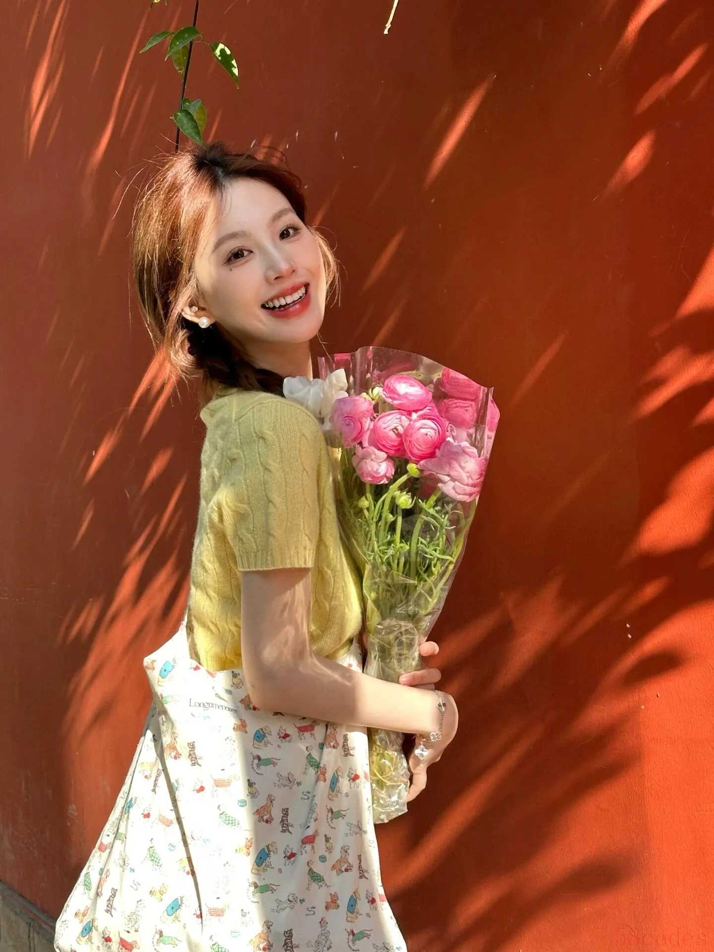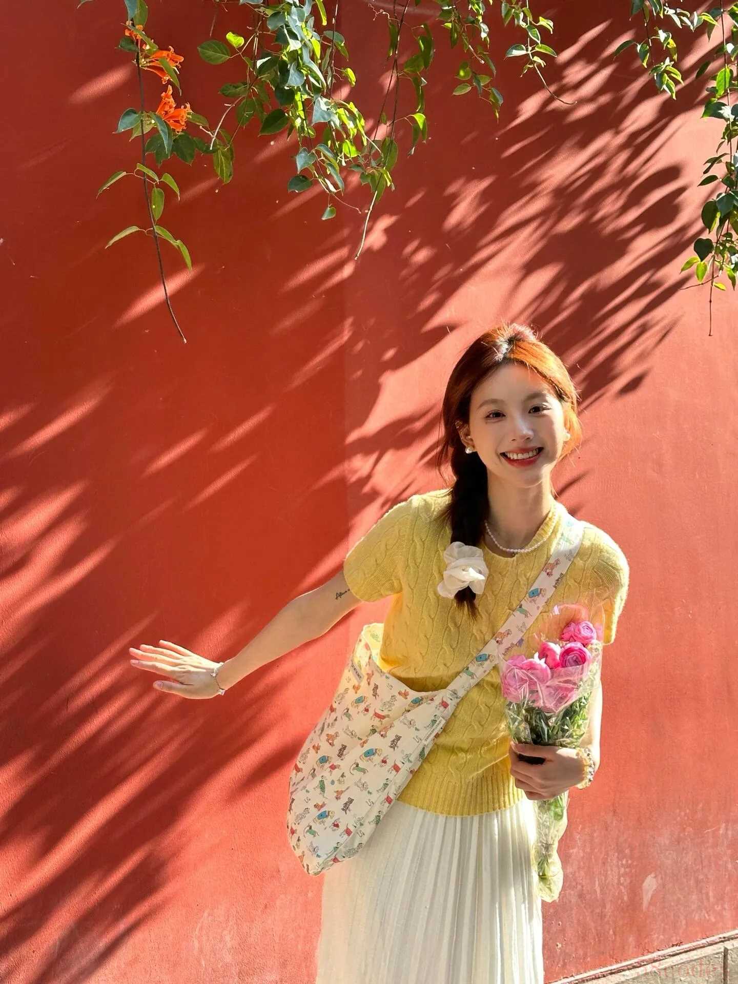 树影下的红墙也特别浪漫,咱们双手抱花侧身站,回眸笑着看镜头,搭子抓拍起来,灵动还有感染力,美得很。