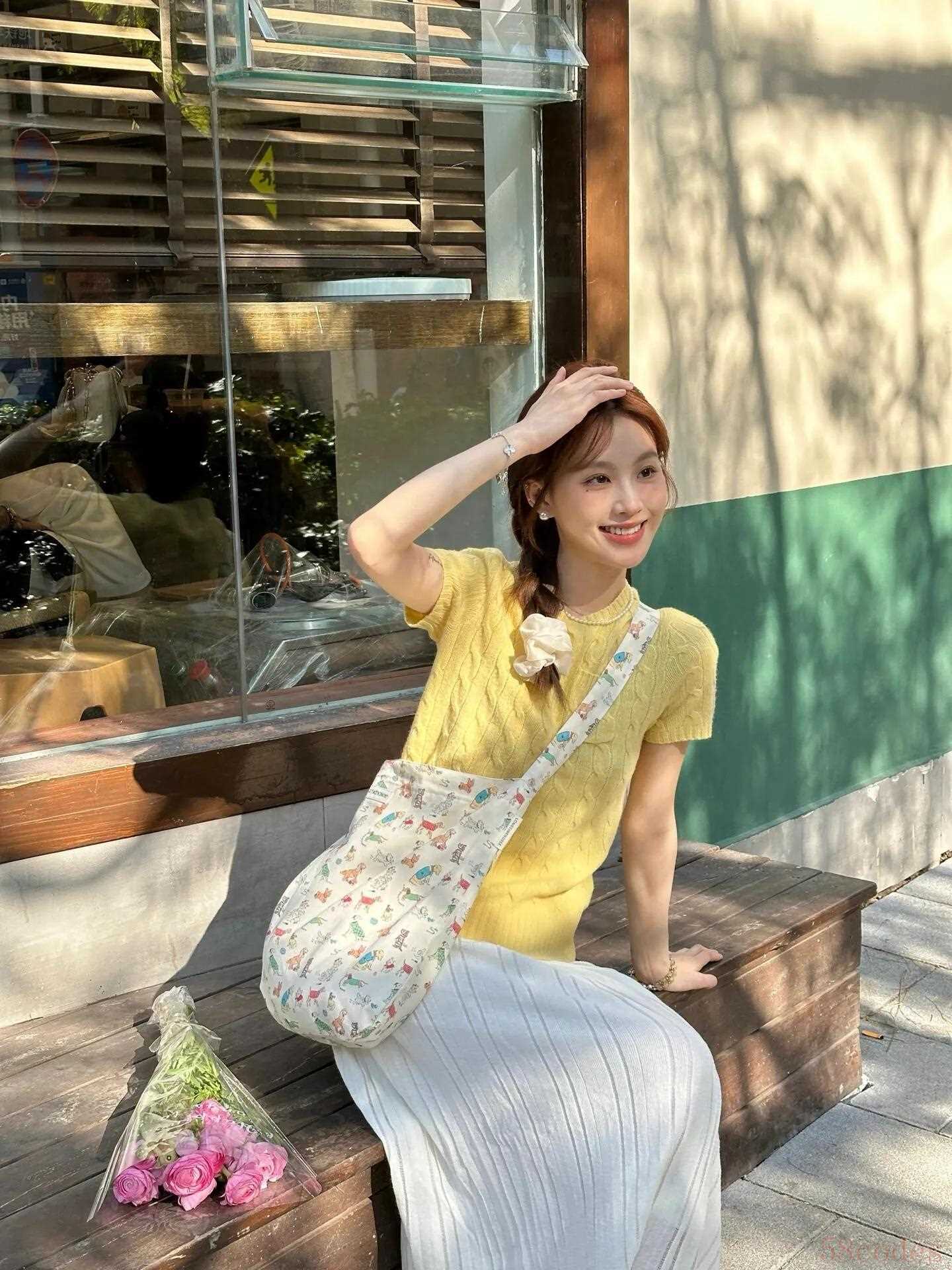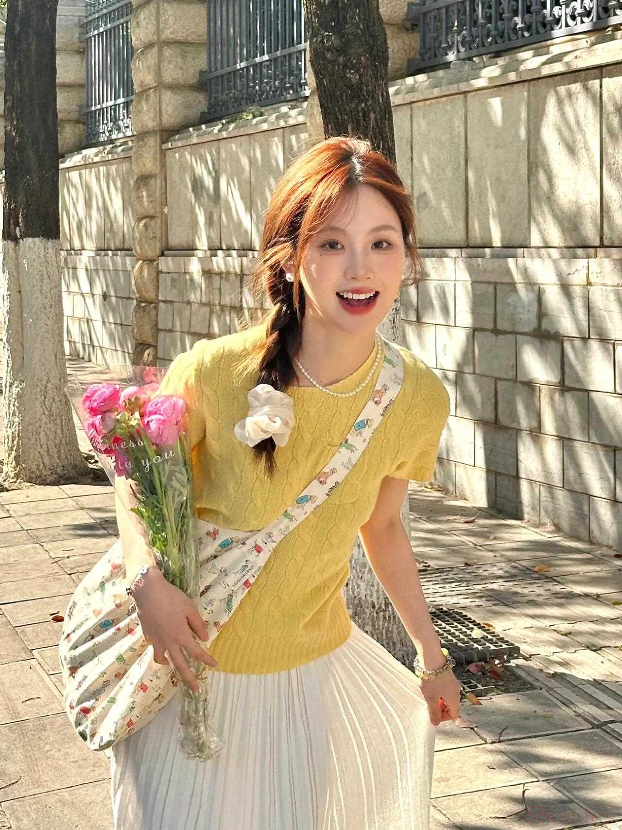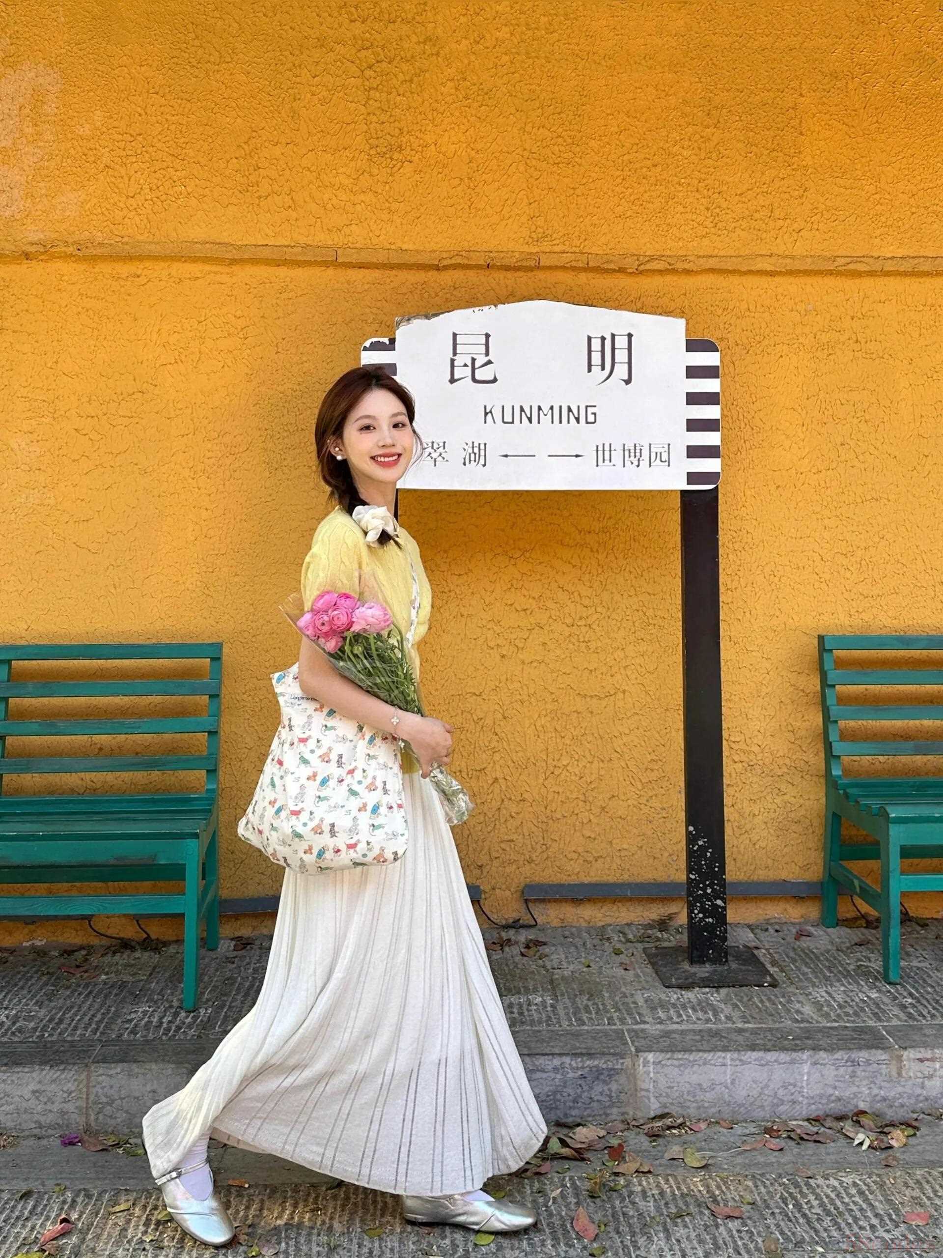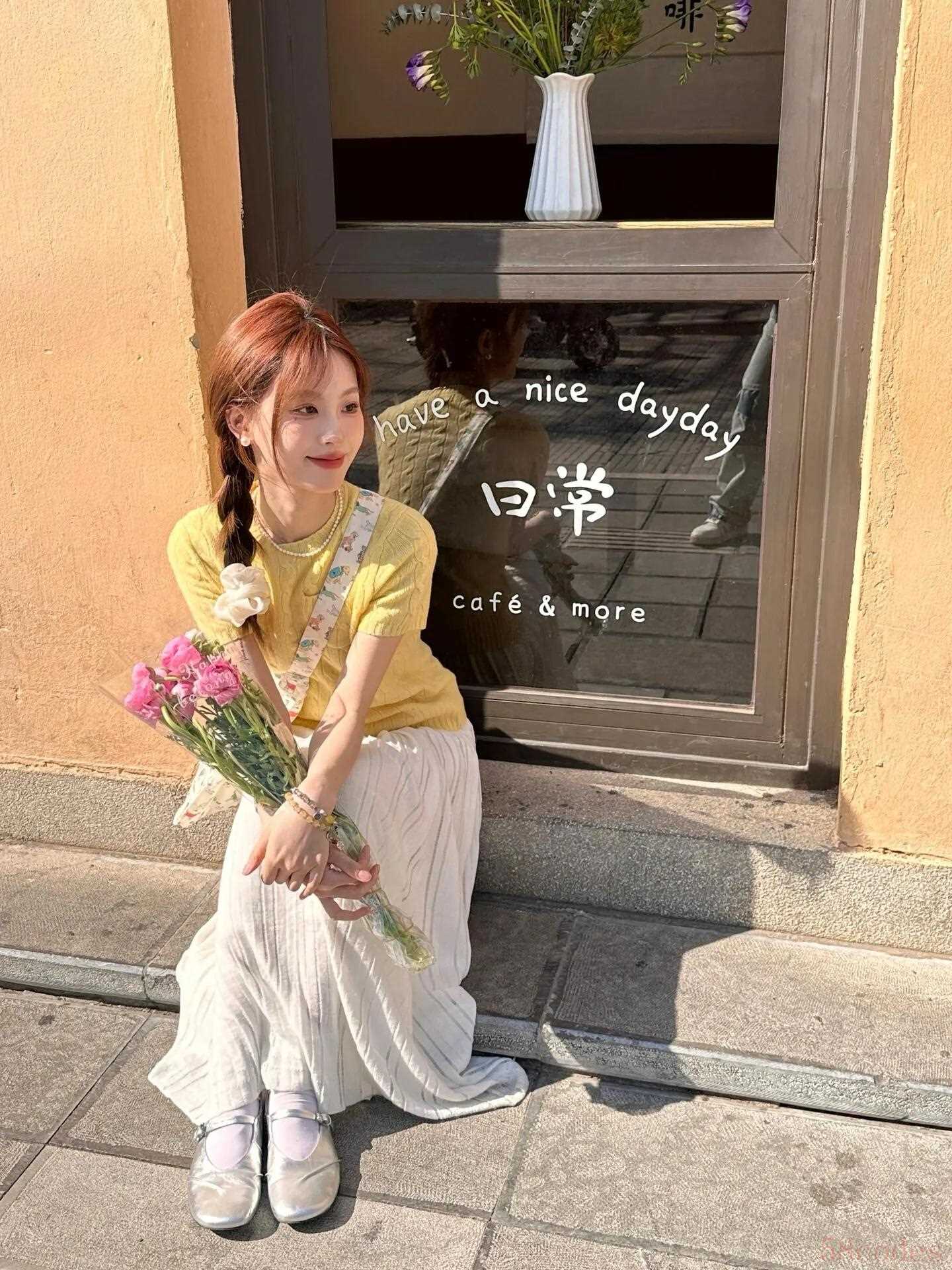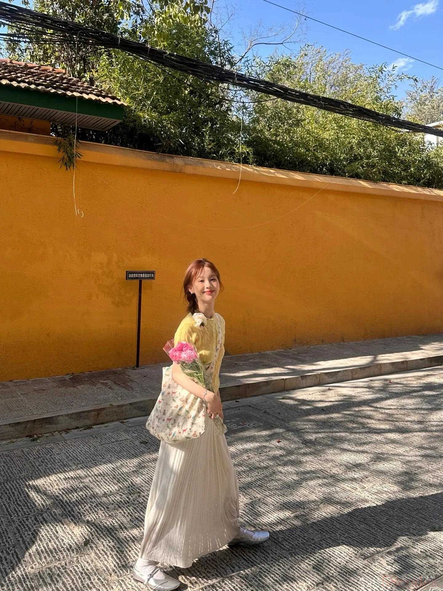 全身照要好看,姿势就不要过于平平无奇啦。我们双手抱花,双腿交叉,用简单的空间错位,把层次感拉出来,还是不看镜头,避免直视镜头的紧张感。搭子拍全景,咱们脚底卡在边框的底部,头顶留出空白,才能苗条显高,氛围感也非常好。