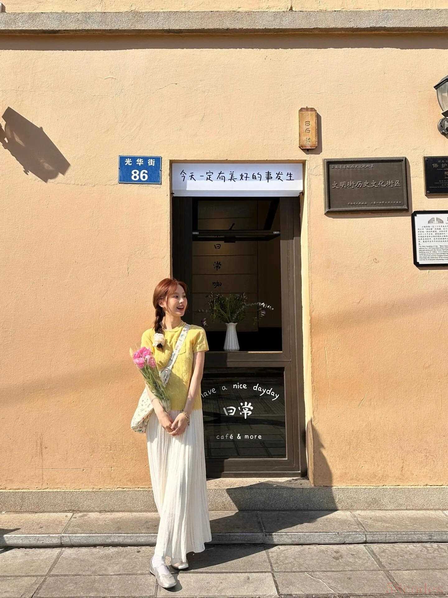 不常面对镜头的话,动起来拍远比拍静态的更加分。我们可以自在向前走,搭子跟着咱们的步伐,连续按下快门,抓拍走动的瞬间。景可以拍大拍全,把道路、墙面的延伸感带一带,纵深效果突出了,咱们也能美得吸睛。