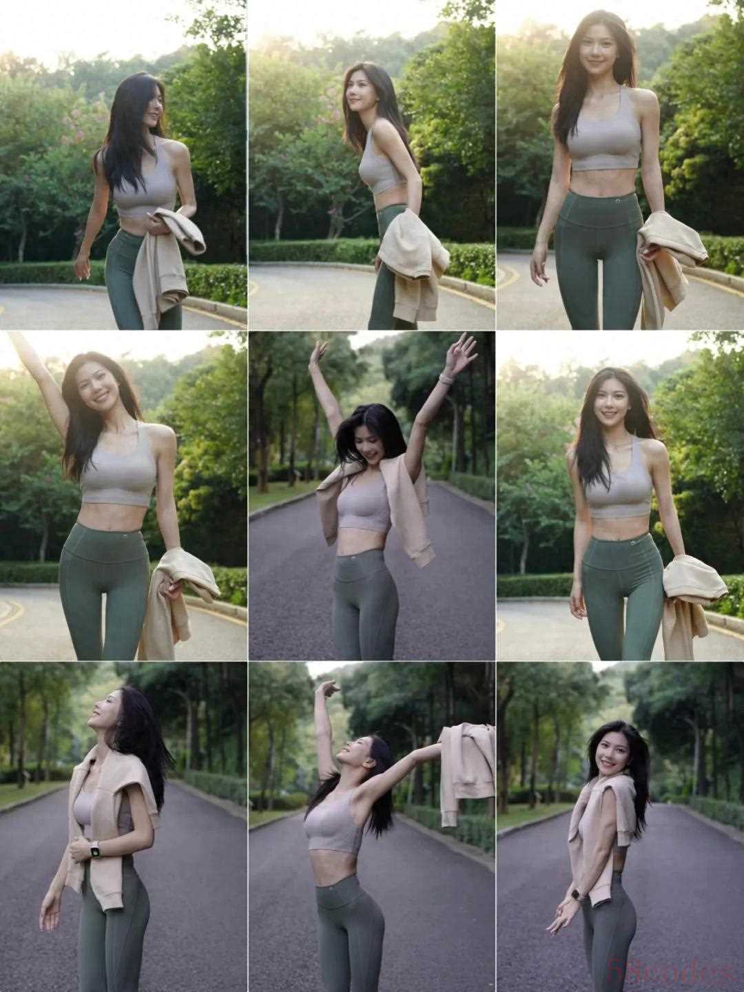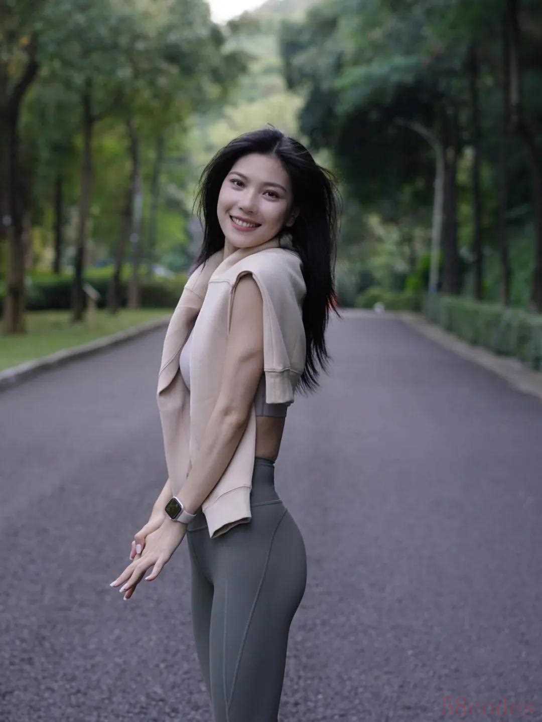 如果背景有路、有草地,就试试这个动作,身体侧着,手自然放在身前,轻轻回头笑,这个角度很显脸小,动作不大但很自然,户外运动拍照拍这种姿势时,重点是别太刻意,眼神柔一点,照片就很有气质。