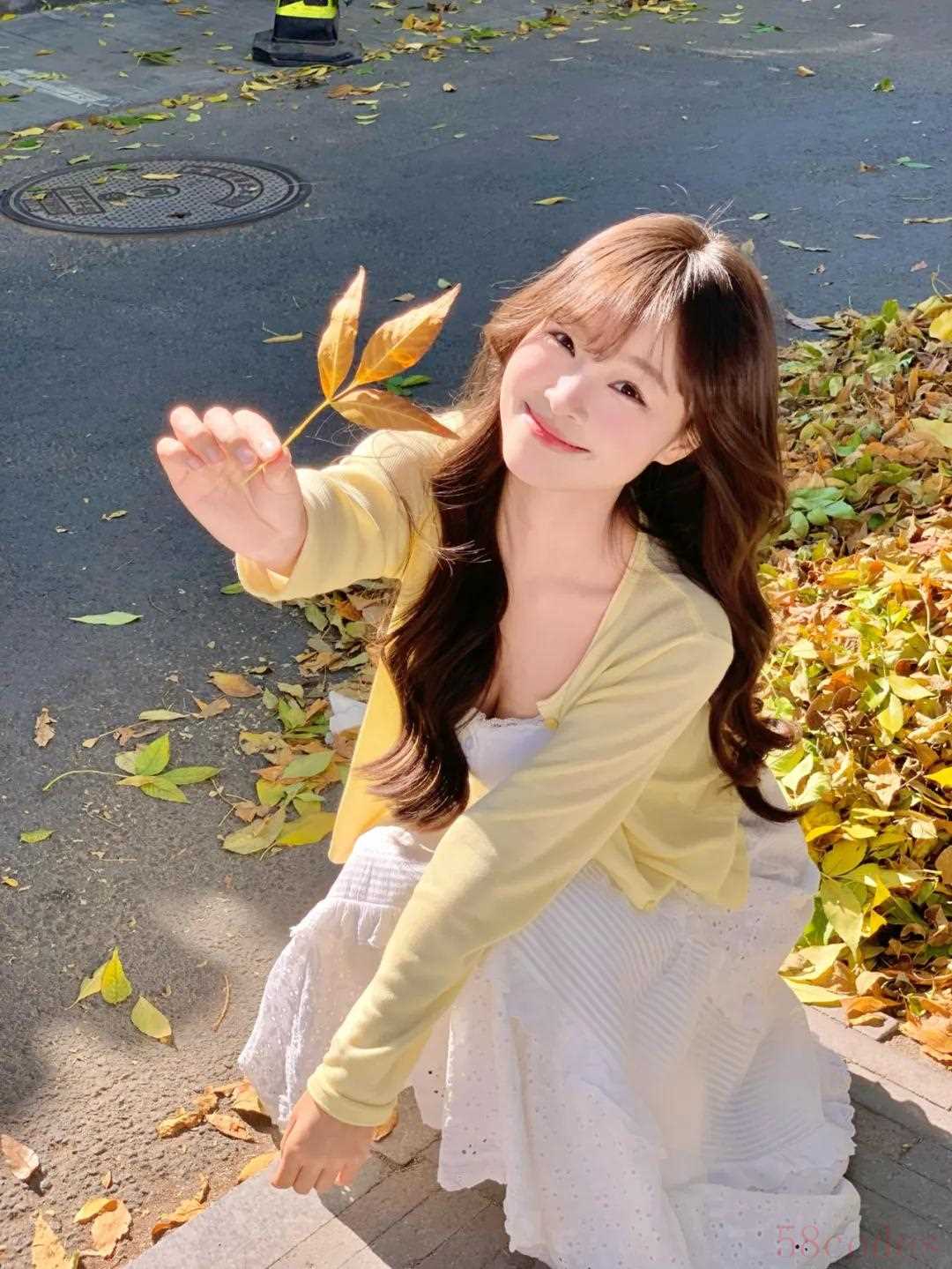 7、侧蹲落叶旁,手拿落叶放脸颊微笑