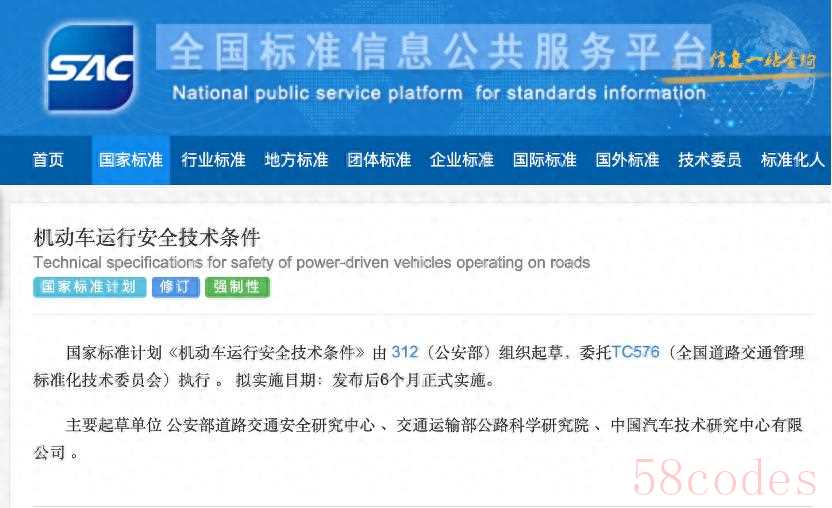 11月12日,据全国标准信息公共服务平台官网,公安部组织起草的国家标准计划《机动车运行安全技术条件》向社会征求意见。该标准主要起草单位有公安部道路交通安全研究中心、交通运输部公路科学研究院、中国汽车技术研究中心有限公司,拟在征求意见稿发布后6个月正式实施,替代现行的GB7258。
