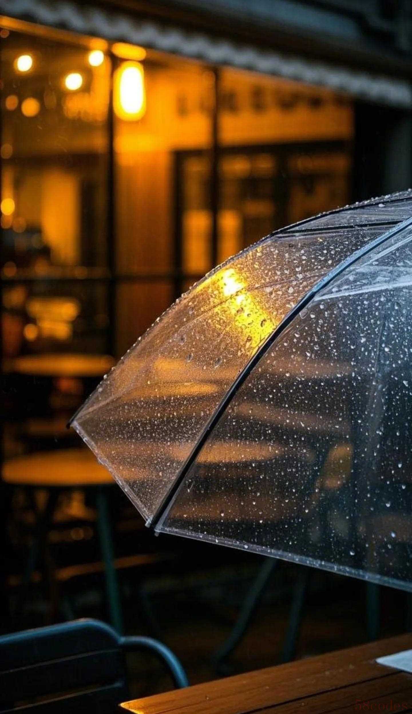 ✔️ 雨天咖啡馆撑透明伞,开启「玻璃折射」特效让伞面映出店内暖光