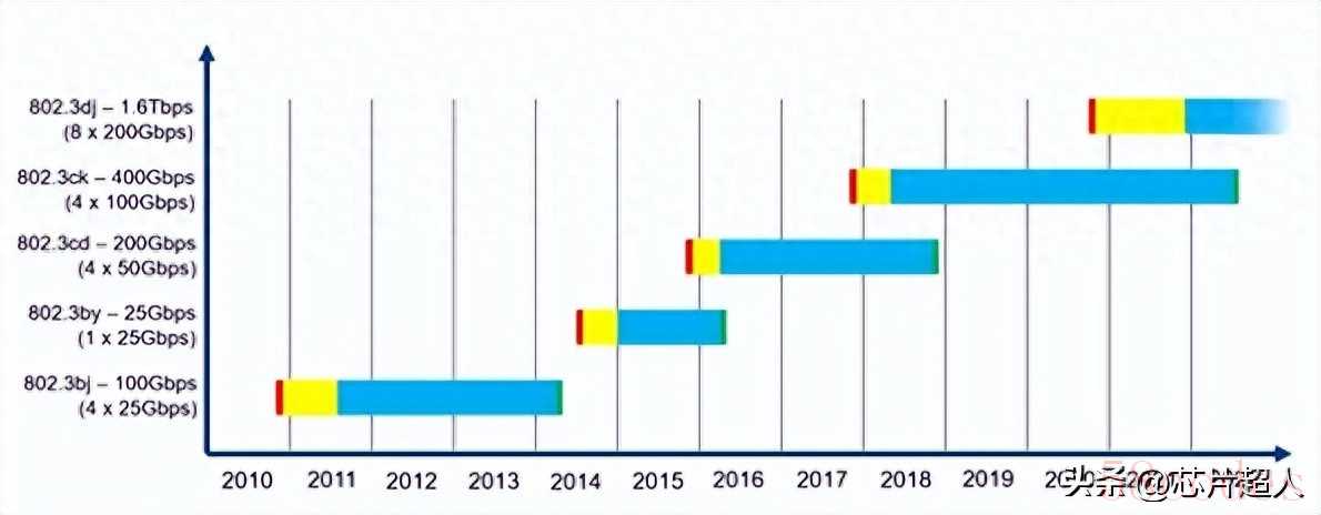 IEEE 802.3系列标准作为以太网技术的基础,近年来不断推动着数据传输速率的提升。从2010年代的100Gbps(802.3bj)和200Gbps(802.3cd),到2020年代的400Gbps(802.3ck)乃至当今的1.6Tbps(802.3dj),以太网技术经历了飞速的发展,目前IEEE 802.3dj单通道支持的最大速率超过200Gbps。与此同时,调制技术也从传统的NRZ(非归零码)向PAM4(四电平脉冲幅度调制)转变,这一转变使频谱效率提升了一倍,为未来实现更高的速率传输提供了可能。