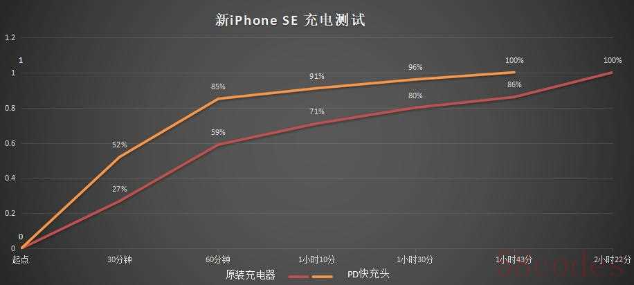 如果选择购买一个PD快冲头,整个充电时间将会大幅度缩短,0至100的充电时间只需要1小时43分钟左右,此外需要注意的是,新iPhone SE支持快充的功率为12W,无论是用18还是20的PD快冲头,最终充电功率只会是12W。