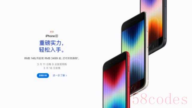 根据官方消息,苹果iPhone SE3将提供64GB、128GB、256GB三种存储容量选择,拥有黑、白、红三款配色,并将于3月18日(星期五)开始发售。