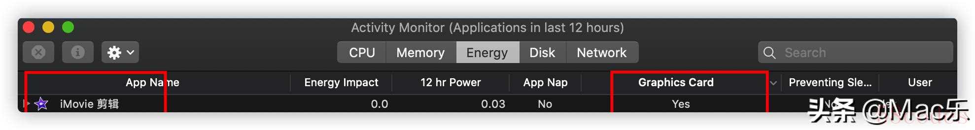 要查看某个应用是不是在使用性能较高的独立 GPU,请打开“活动监视器”,然后点按“能耗”标签页。如果您没有看到“要求高性能 GPU”列,则说明您的电脑只配备一个图形处理器。