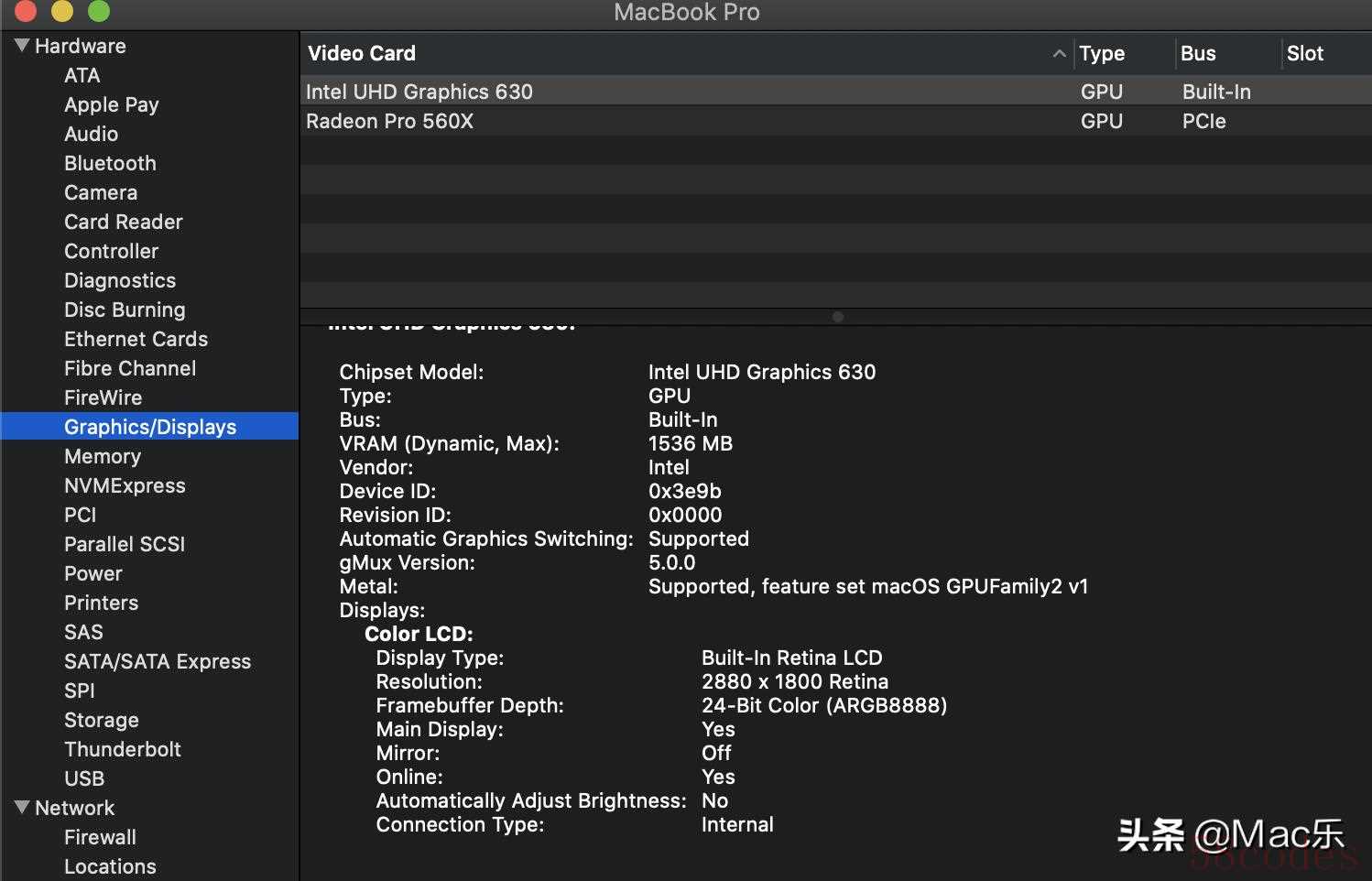 左上角小Logo,About This Mac==Overview==System Report==Hardwaare==Graphics/Displays