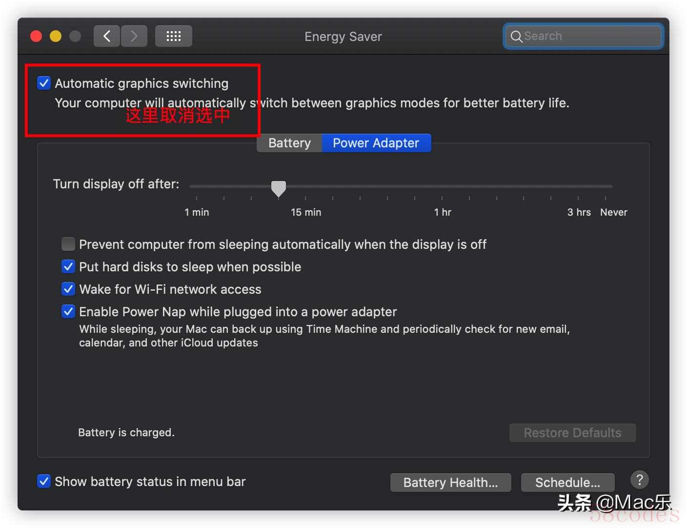 在系统默认设置中,macOS 会优先启用集成显卡。主要是集成显卡比较省电,虽然比不上独立的显卡,但在一般使用上,例如看电影或文本文档处理工作,Intel 的集成显卡还是可以轻松应付的。不过在进行多任务处理时,Intel 的显卡面对 Retina 显示屏的需求,就会显得吃力了。那么我们要如何将系统切换到启用独立显卡呢?其实很简单,进入系统偏好设置,进入「节能」选项,然后将「自动切换显卡」这一选项取消打勾即可,这样电脑就会默认全程使用独立显卡了。不过需要提醒的是,使用独立显卡会增加整机功耗,因此在使用电池供电的时候续航会下降得比较明显。