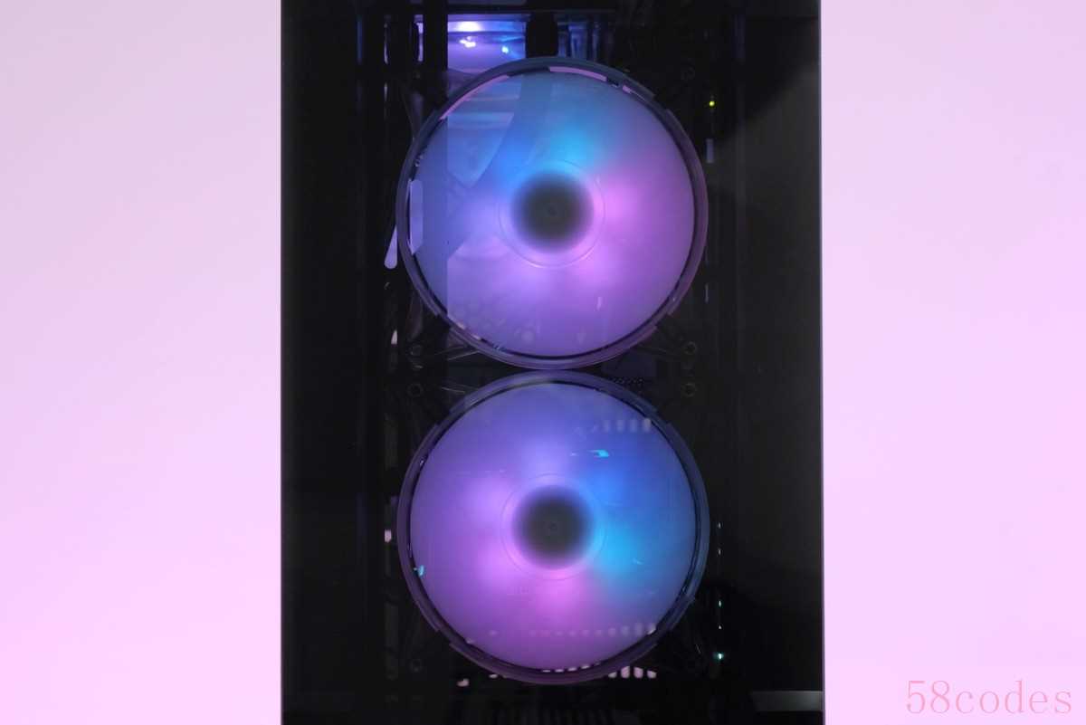 从正面看,半透灰的钢化玻璃不仅可以有效过滤刺眼的灯光,直视起来更加舒适,而且机箱内RGB风扇的灯光都可以一览无遗尽收眼底,电竞感满满。