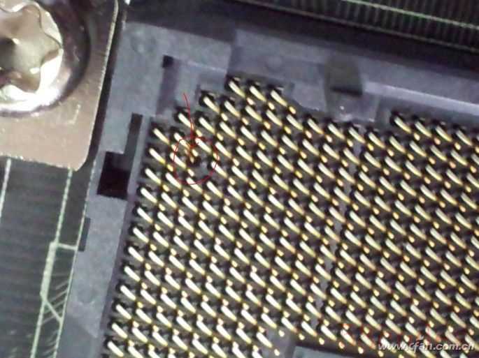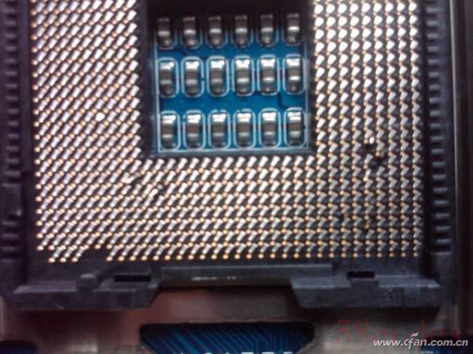 CPU或CPU插座有缺针或松动:这类故障表现为点不亮或不定期死机。需要打开CPU插座表面的上盖,仔细用眼睛观察是否有变形的插针,其中AMD处理器主要需要观察CPU的针脚部分(图3),而Intel处理器则要观察主板LGA插座内的针脚情况(图4)。