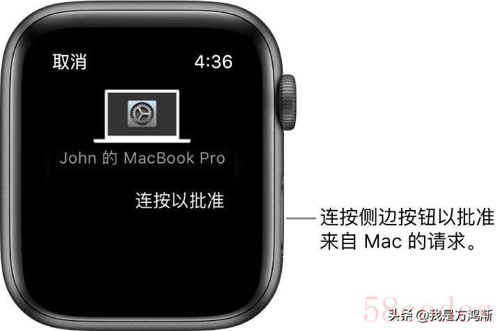Apple Watch 显示来自 MacBook Pro 的批准请求。