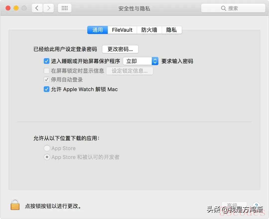 4.Mac 设置:选取苹果菜单 >“系统偏好设置”,然后点按“安全性与隐私”。点击“通用”,然后选择“使用您的 Apple Watch 解锁 App 和 Mac”(Apple Watch 需安装 watchOS 6 时可用)。如果 Apple Watch 安装的是 watchOS 3、watchOS 4 或 watchOS 5,请选择“允许 Apple Watch 解锁 Mac”。(不能批准 App 请求。)在选择任何选项前,可能需要点按面板底部的锁图标,然后输入管理员名称和密码。