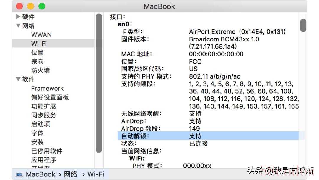 -如果不确定你的 Mac 是否支持“自动解锁”和“使用 Apple Watch 批准”,请选取苹果菜单 >“关于本机”,然后点按“系统报告”。在边栏中,点按“网络”,点按“Wi-Fi”,然后在右侧查找“自动解锁:支持。”