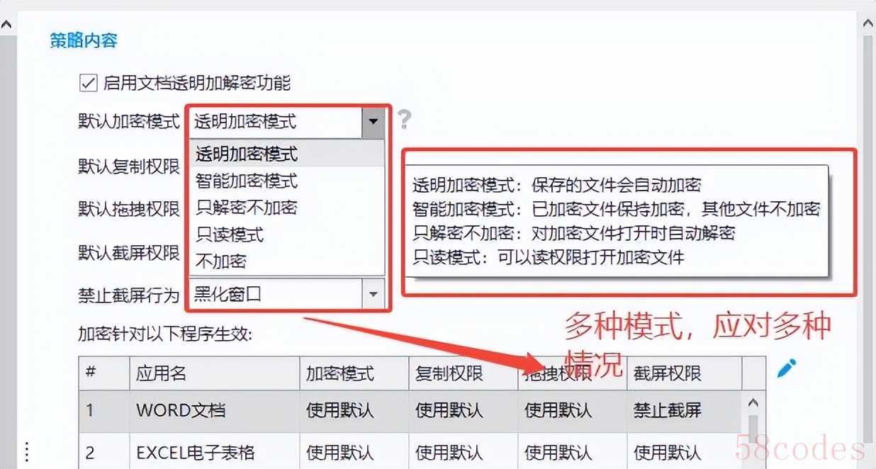 支持智能加密(兼容内部加密文件且保存后仍加密)、落地加密(文件到本机即强制加密),还可灵活设置只解密不加密(老板模式)、不加密、只读等权限。